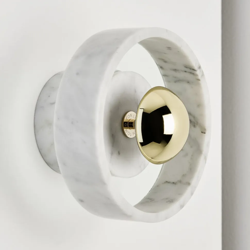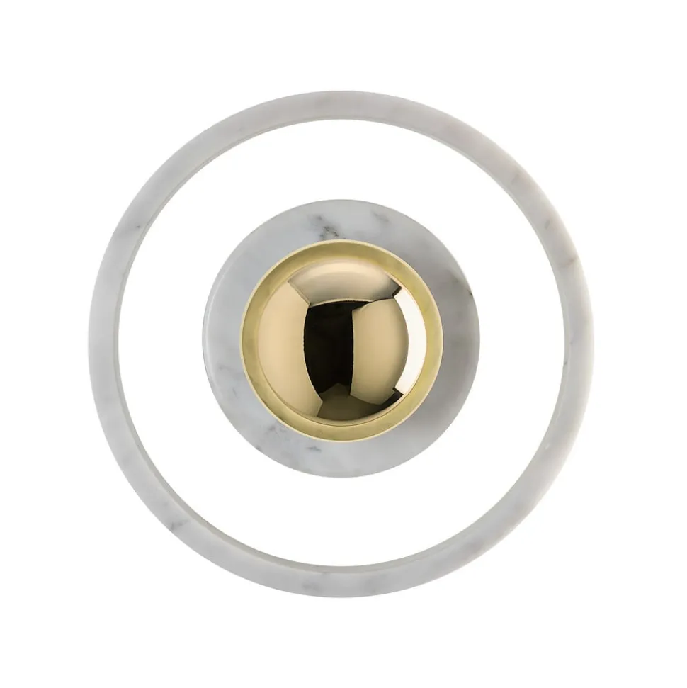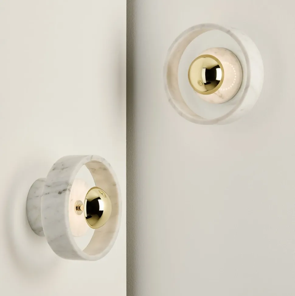 Beskyttet mod vandsprøjt: Stone Wall LED-væglampen er lavet af marmor, glas og stål I centrum af Stone Wall LED-væglampen er den gyldne skærm lavet af glas og stål. På grund af sin lille størrelse holder den sig diskret i baggrunden. De øvrige dele af denne designer-væglampe er lavet af hvid marmor, hvis fine struktur gør Stone Wall til et blikfang, selv når den er slukket. Det er den samme marmor, som blev brugt til at bygge det berømte Taj Mahal i Indien. Selv om Stone Wall derfor er ret tung og slidstærk, giver dens kunstneriske design den en vis lethed. Takket være IP44-beskyttelsesgraden er den også beskyttet mod vandstænk, hvilket betyder, at den også kan installeres på badeværelset. Indvendigt er der brugt LED’er af høj kvalitet, som giver en behagelig belysning med varmt, hvidt lys.