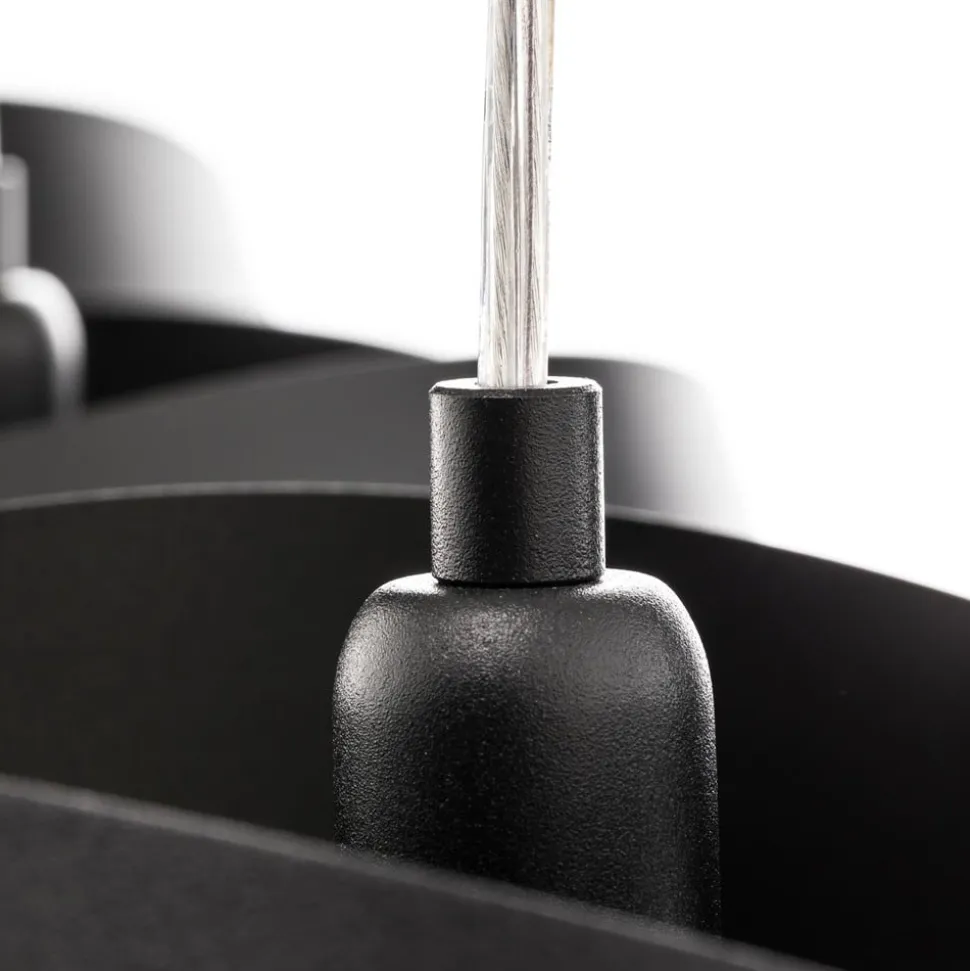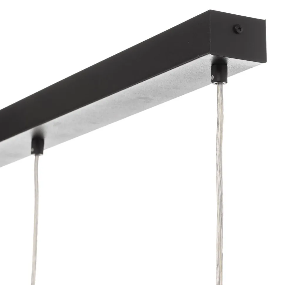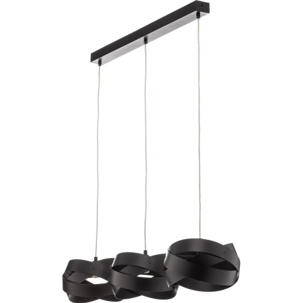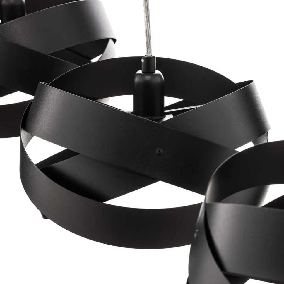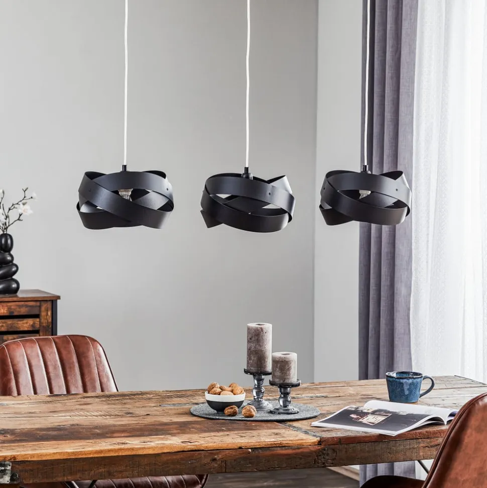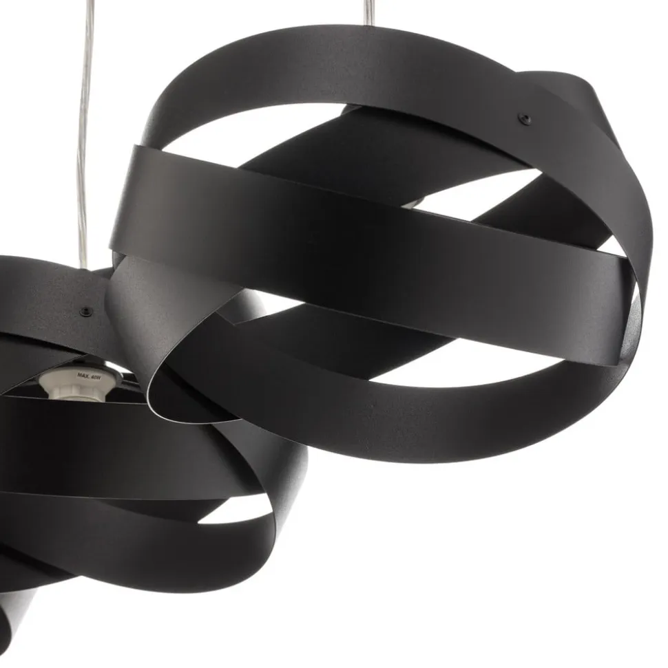 Tornado-pendellampen med tre flammer er perfekt til at belyse et spisebord eller en bar i et moderne rum. Deres nuancer, der hver er lavet af tre overlappende metalstrimler, tillader lyset at trænge direkte opad og nedad, men en del af det falder også gennem mellemrummene mellem de enkelte metalstrimler og skaber unikke lyseffekter i rummet. På grund af den matte sorte farve bliver hængelampen en slående lysgenstand over hvert bord.