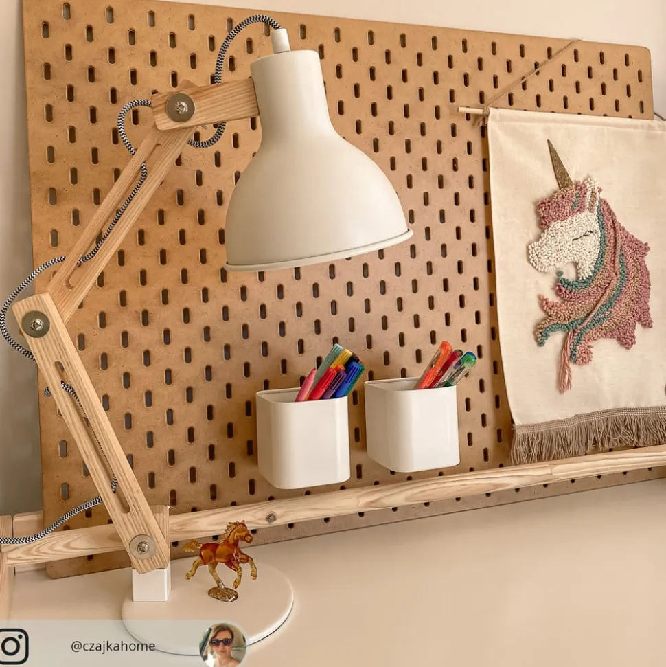 Flot skrivebordslampe i træ Shivanja med hvid metalskærm Hvis du har indrettet din bolig i en moderne eller skandinavisk landlig stil, er lamper med træelementer altid en fin tilføjelse. Det er især tilfældet med bordlampen Shivanja i træ, som kombinerer metal og træ. Skærmen og foden er lavet af metal med en mat hvid finish, mens stellet er lavet af træ med en askefinish. Ideelt set bør lampen placeres på et skrivebord. Ledningen er udstyret med en afbryder og har et trendy zebramønster, da den er dækket af sort og hvidt stof.