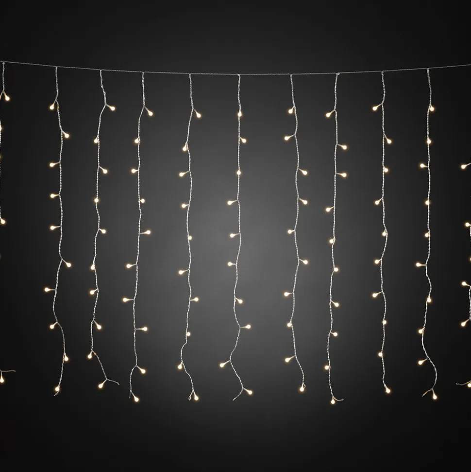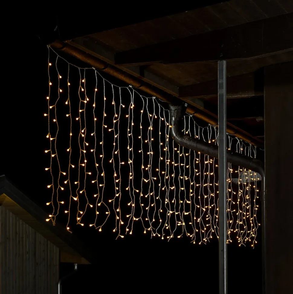 400-lys mikrolysgardin giver festlig udendørs dekoration De enkelte tråde i dette lysgardin er hver 1 meter lange, og kablet er gennemsigtigt. 400 jævnt fordelte lysdioder oplyser den mørke vinternat med varmt hvidt lys og skaber et lysskær, der får alle til at glæde sig til jul – Udendørs transformer medfølger