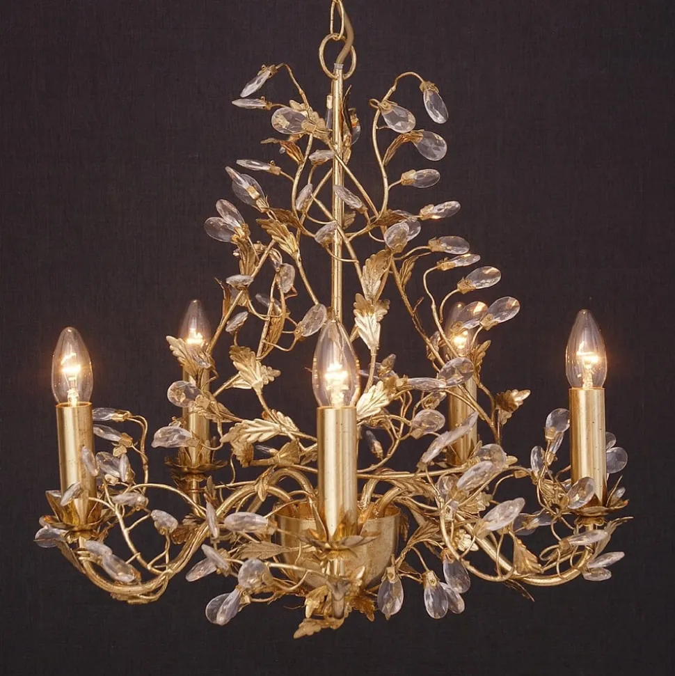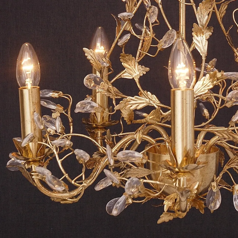 Lysekrone Buono – dækket med bladguldDenne usædvanligt smukke og rigt dekorerede lysekrone BUONO stråler med en buet jernramme med bladguld, hvorfra utallige klare krystaller forgrener sig som blade på et træ, hvor lyset brydes effektivt. Fem guldfarvede lysestager sørger for, at krystaller og bladguld funkler om kap. BUONO-lysekronen kombinerer dygtigt design og forarbejdning af høj kvalitet og er et vigtigt bidrag til at skabe en festlig atmosfære.