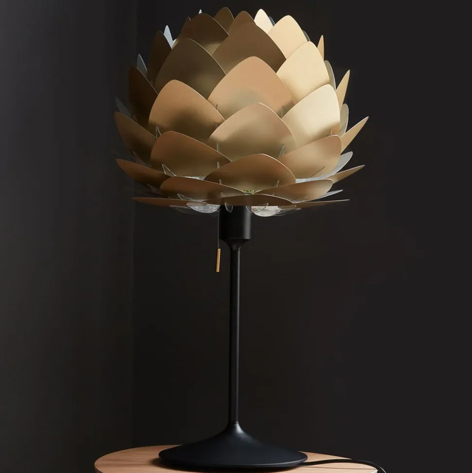 Aluvia mini er en dekorativ lyskilde og et indretningsobjekt til den moderne bolig og lounge. Skærmen fremhæves perfekt af det diskrete sorte bordstativ. Med mange overlappende aluminiumselementer i børstet messinglook følger den formen af en eksotisk blomst. En USB-port i bunden af stativet kan bruges til at oplade f.eks. en smartphone.