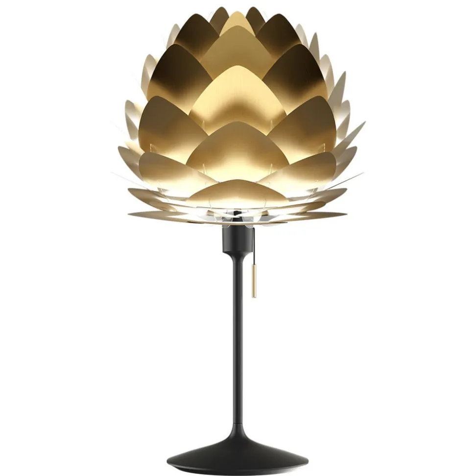 Aluvia mini bordlampe – messingfarvet skærm på sort stangstativ