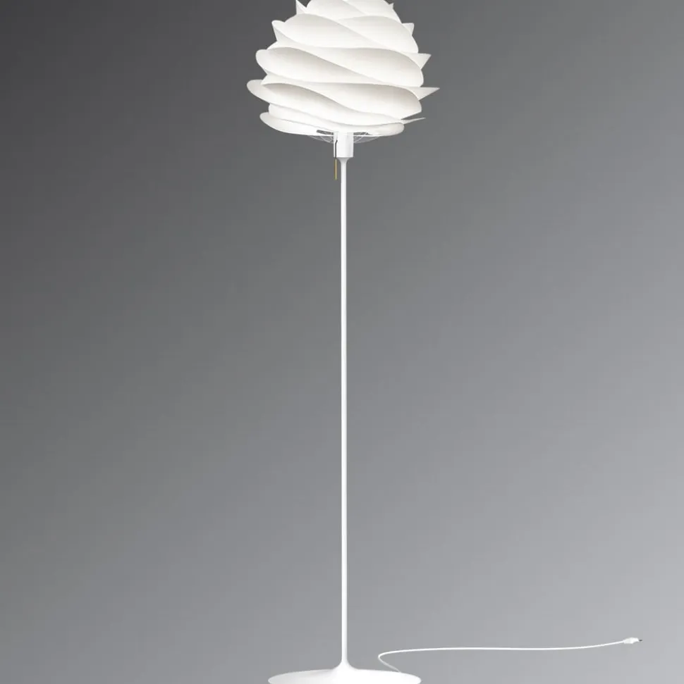Carminas ubrydelige plastskærm, som fanger øjet med sin bløde bølgeform og den deraf følgende lyseffekt, suppleres af et hvidlakeret, slankt metalstel for at skabe en gulvlampe, der med sit design gør sig bemærket overalt.