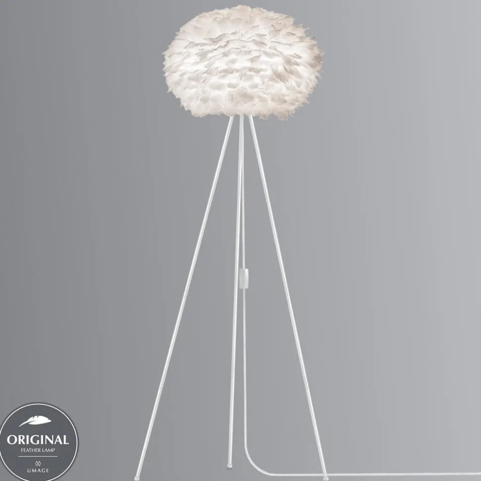 Begge komponenter som standerlampen Eos består af, skærmen Eos medium samt det hvide, trebenede gulvstativ Tripod, er skabt af designeren Søren Ravn Christensen. Den vidunderlige fluffy skærm er udstyret med ca. 1.800 ægte gåsefjer, hvilket ikke blot visuelt, men også haptisk er noget helt særligt. Lysudsendelsen gennem den fjerbelagte skærm er både meget blid og stemningsfuld.