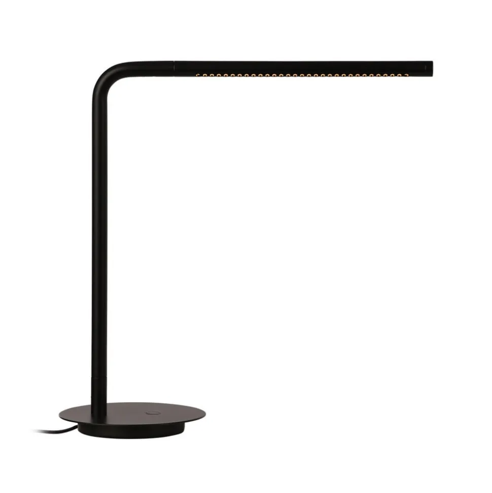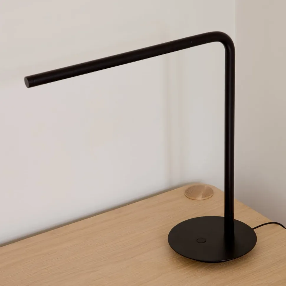 Omni LED-bordlampe med dæmper og USB-stik, drejeligt hoved Omni Table LED-skrivebordslampen kombinerer form og funktion. Lampen er designet af Søren Ravn Christensen, chefdesigner og medejer af UMAGE, og den passer ind i ethvert interiør og er kendetegnet ved enkel elegance. Omni Table er en multifunktionel bordlampe i aluminium og stål, som til enhver tid oplyser det ønskede område takket være det 360° drejelige og 45° svingbare stavformede hoved. Den kan ikke kun tændes og slukkes, men også dæmmes ved hjælp af knappen på basen. Der er også en USB-port i bunden af armaturet, som kan bruges til at oplade en telefon eller tablet, der er tilsluttet armaturet.