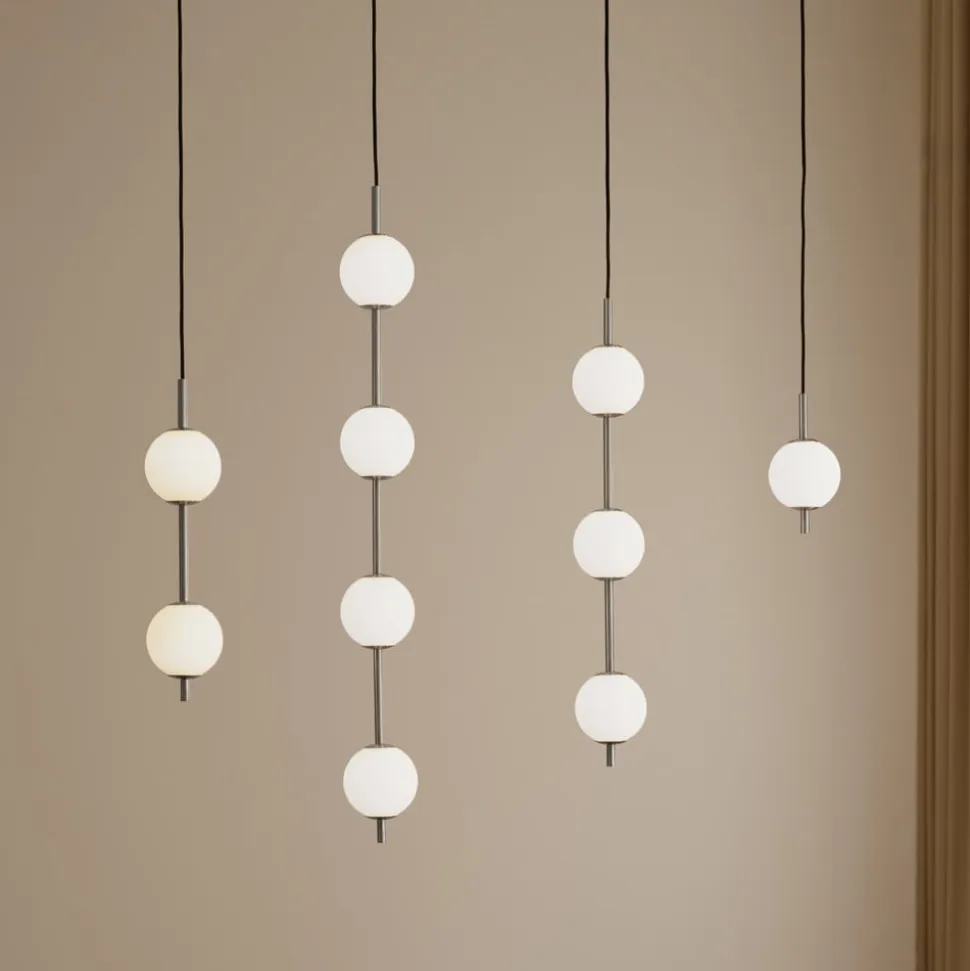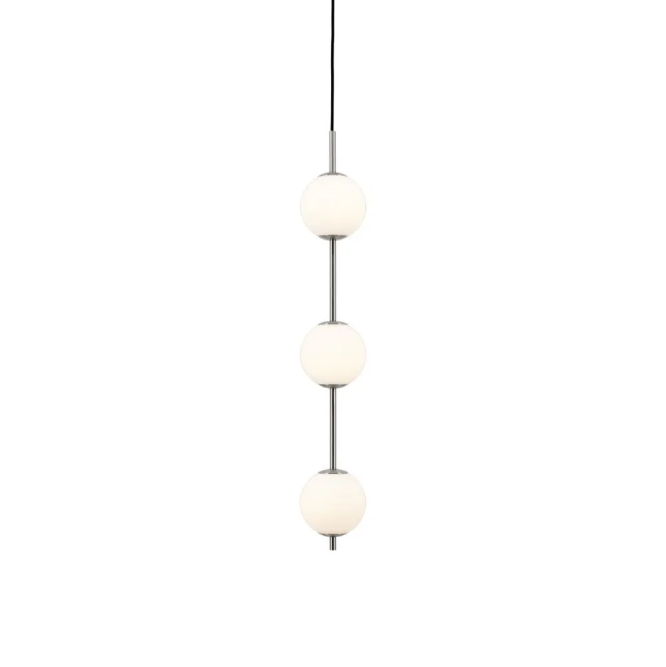 LED-pendellampe Audrey i stålfinish med tre opalglaskugler, der lyser rundt om