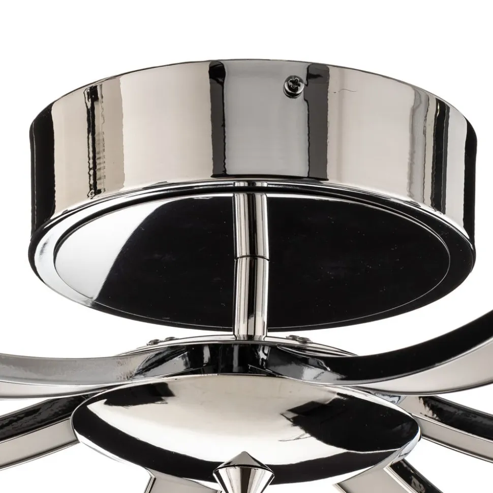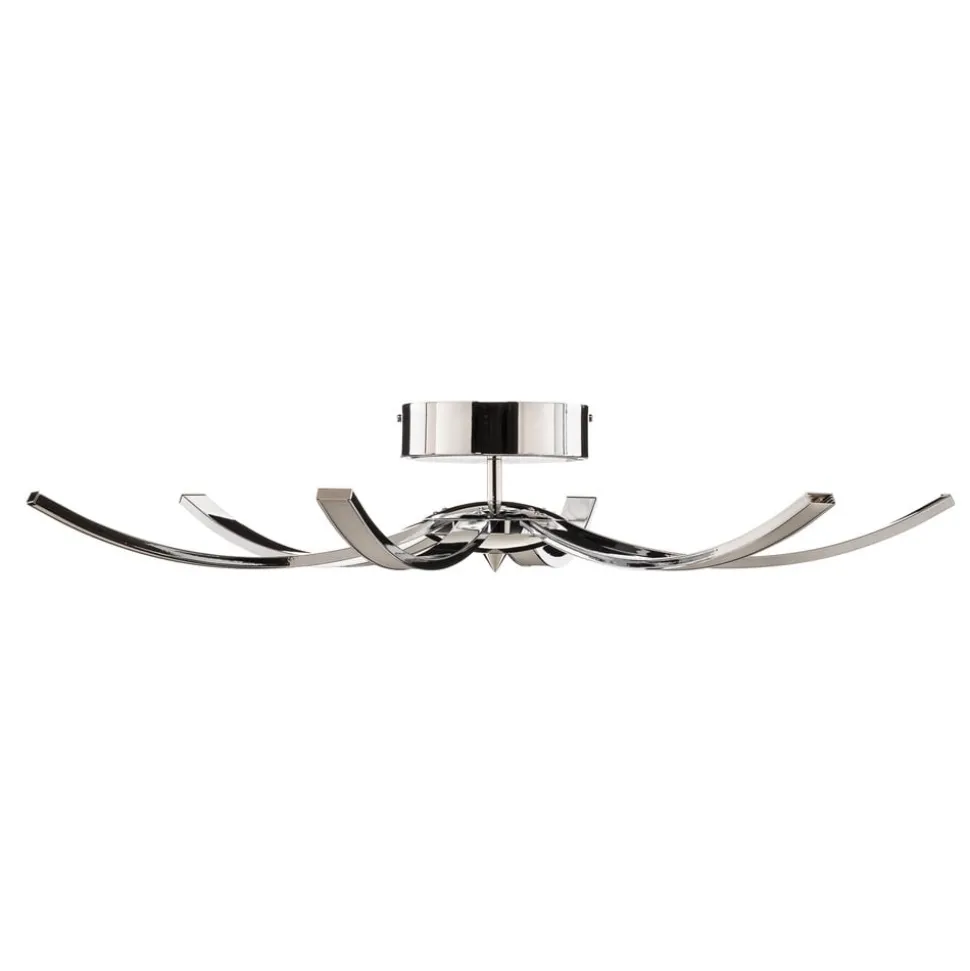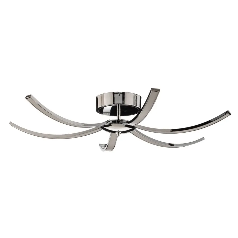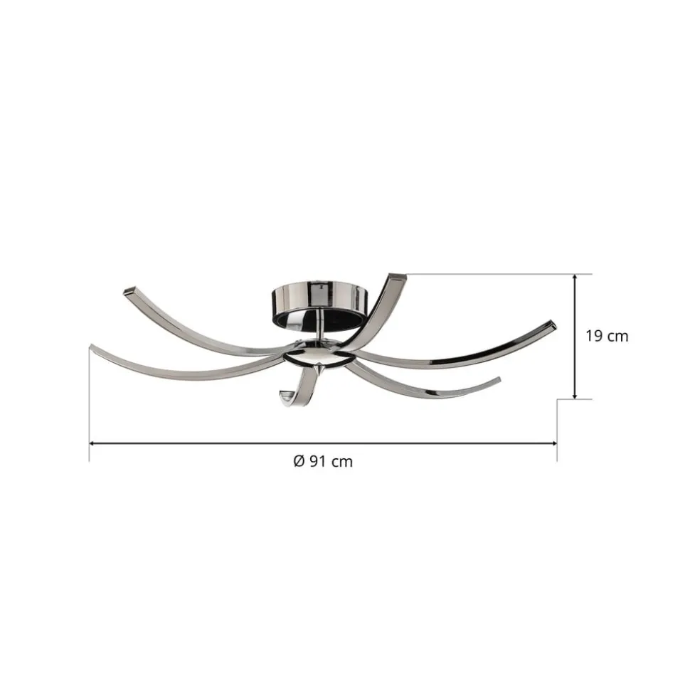 Umbra kombinerer ekstraordinært design, moderne belysningsteknologi og ren elegance. Den kromfarvede loftslampe består af et rundt loftsbeslag, en kort, lodret arm, en rund midtersektion og seks arme, der strækker sig regelmæssigt ud til siderne. Sidstnævnte er diskret buet nedad og udstyret med integrerede LED-strips på undersiden, hvis lys hovedsageligt udsendes direkte nedad. Den medfølgende fjernbetjening gør det muligt at skifte og dæmpe loftslampen nemt og bekvemt.