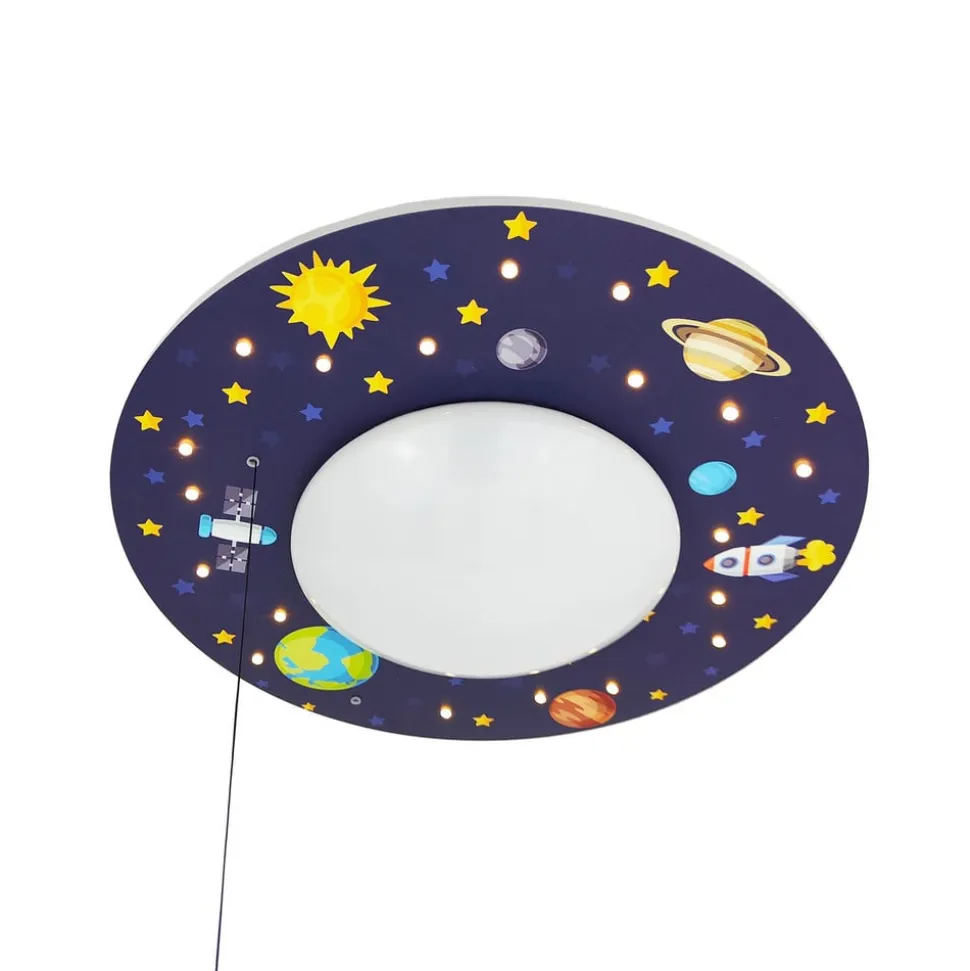 Med trækafbryder: Loftslysunivers med stjernehimmelLoftslysuniverset er velegnet både som generel belysning på børneværelset og i sin funktion som stjernehimmel. 20 individuelle LED’er indlejret i loftspladen funkler som små stjerner. Hovedlyskilden er en E27-fatning (pære medfølger ikke). Den kan deaktiveres med en trækkontakt, hvis man kun ønsker at lade stjernehimlen skinne. Optisk er Weltall en overbevisende børneværelseslampe med forskellige planeter og stjerner samt en raket og en satellit, som er trykt på loftpladens mørkeblå baggrund.