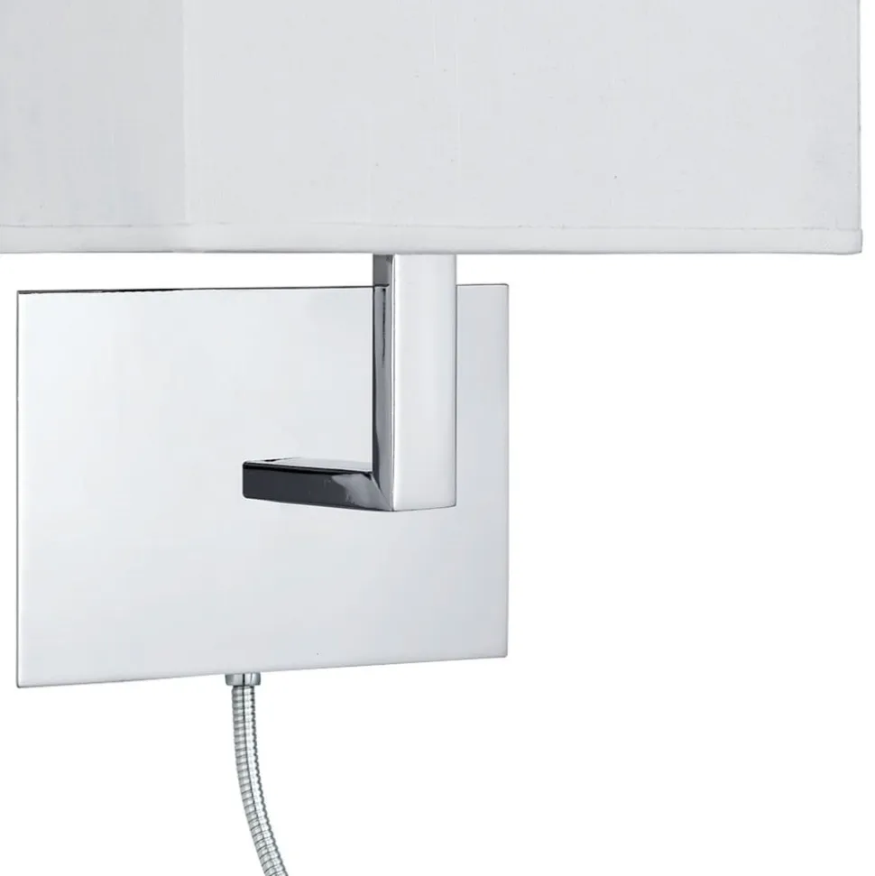 Forkromet 6519-væglampe med tekstilskærm og LED-læselampe 6519-væglampen er det perfekte alternativ til en natbordslampe. Monteret på væggen ved siden af sengen giver lampen ikke kun generel belysning, der dæmpes af den hvide tekstilskærm, men også ekstra retningsbestemt lys, der genereres af en LED i læselampen. Læselampens arm er helt fleksibel, så lysstrålen kan rettes præcist. To separate vippekontakter bag det forkromede metaldæksel gør det muligt at tænde og slukke for begge lyskilder hver for sig. Væglampen er et meget godt valg, ikke kun i soveværelset derhjemme, men også på hoteller.
