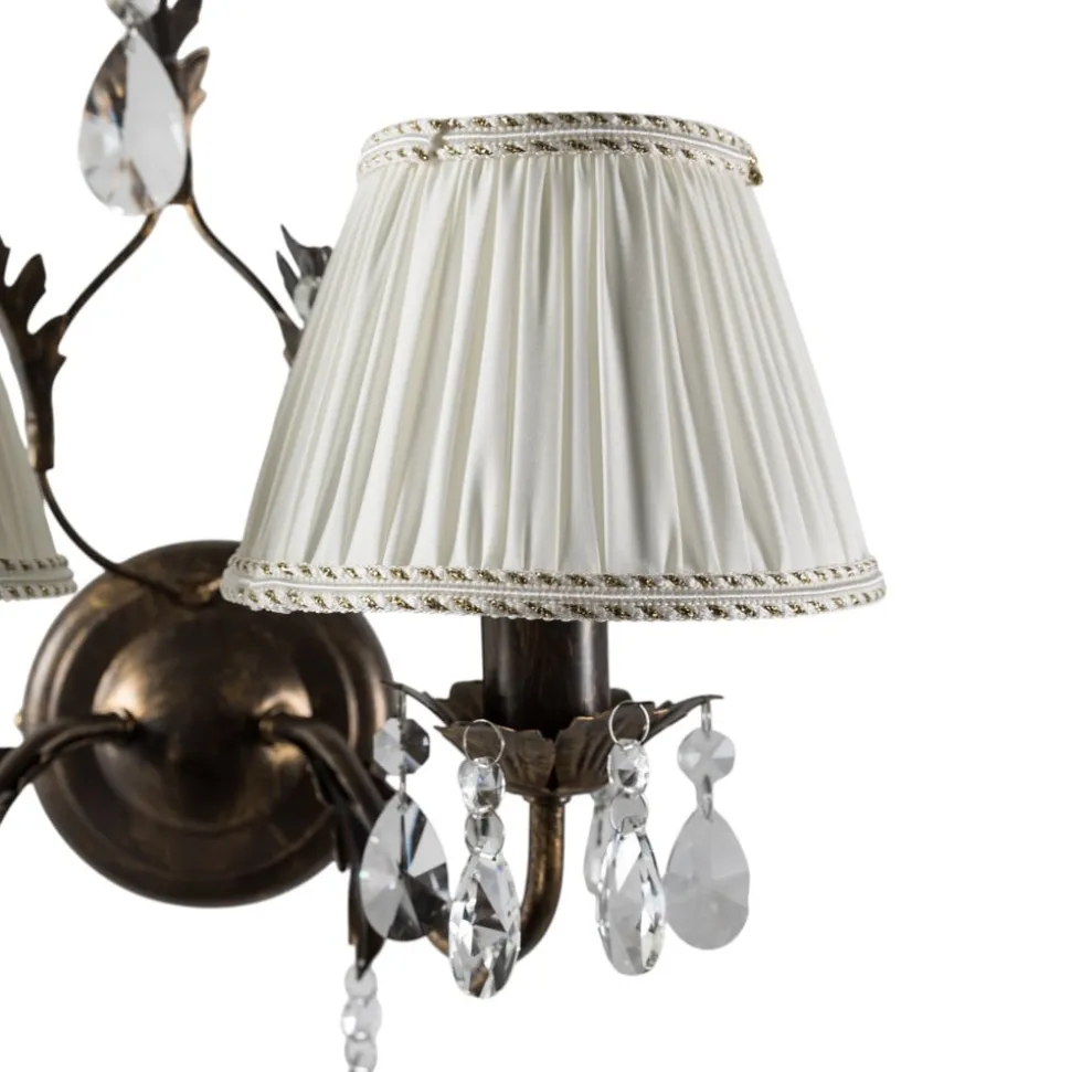 To-lys Karen væglampe i bronze med tekstilskærme Karen væglampen er designet i stil med en lysekrone med en metalramme med buede arme og krystalpendler og to samlede skærme af lyst stof. I kombination med en lysekrone og andre lamper fra serien kan den bruges til at oplyse et helt rum på en stilfuld og romantisk måde.