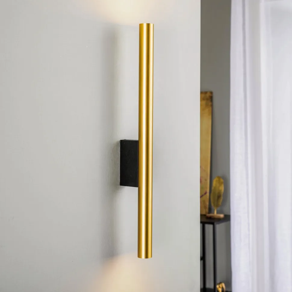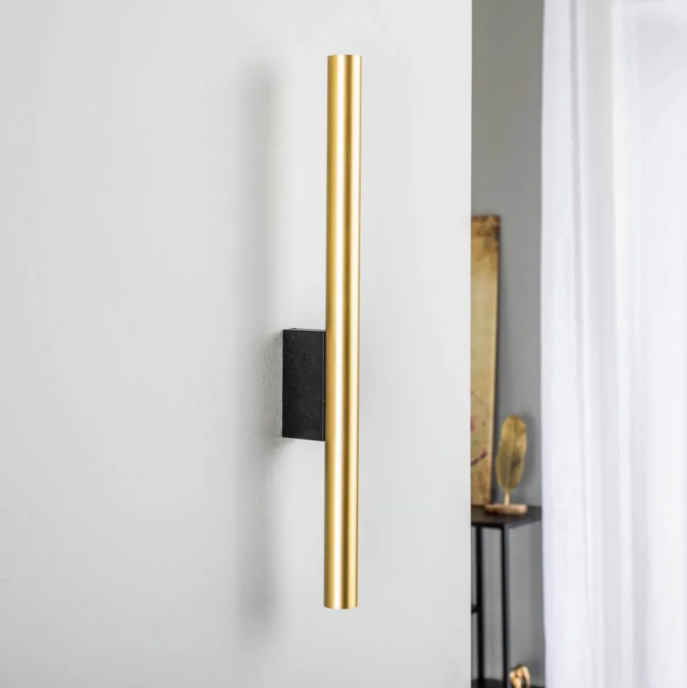 Væglampe Laser i elegant messing og sort kombinerer moderne design med funktionel belysning. Denne lampe er fremstillet af højkvalitetsstål og er et stilfuldt supplement til stuer og soveværelser samt entreer og spisestuer. Den standardiserede G9-fatning gør det nemt at udskifte LED-lyskilden, hvilket sikrer lang levetid.