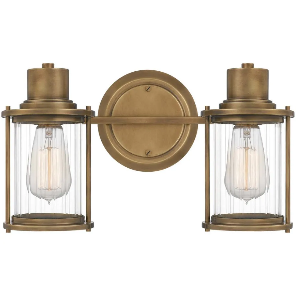 Riggs-væglampe med IP44-beskyttelse, to lys Riggs-væglampen med to lys er lavet af stål og har en antik messingfinish. Skærmenes klare glas med et rillet mønster og metaludtagene i bunden fuldender lampens look. Riggs-væglampen monteres over badeværelsesspejlet og giver et behageligt lys på badeværelset, hvor den kan bruges uden problemer takket være IP44-beskyttelsesgraden.