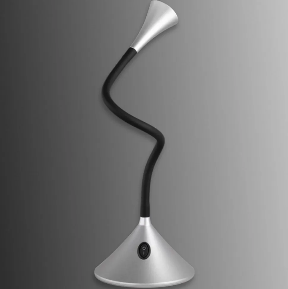 Alsidig Viper LED-bordlampe i sort-sølv Uanset om den placeres på skrivebordet som en simpel bordlampe eller monteres på væggen som en fleksibelt drejelig væglampe – Viper LED-bordlampen er alsidig. Lampens arm kan – som navnet antyder – bøjes som en slange i alle retninger, så et bestemt område kan oplyses. Uanset hvor der er brug for lys på bordoverfladen, kan armaturhovedet bøjes med en enkel bevægelse. Lyset fra den energieffektive, varmhvide LED-lampe skaber en behagelig arbejdsatmosfære.
