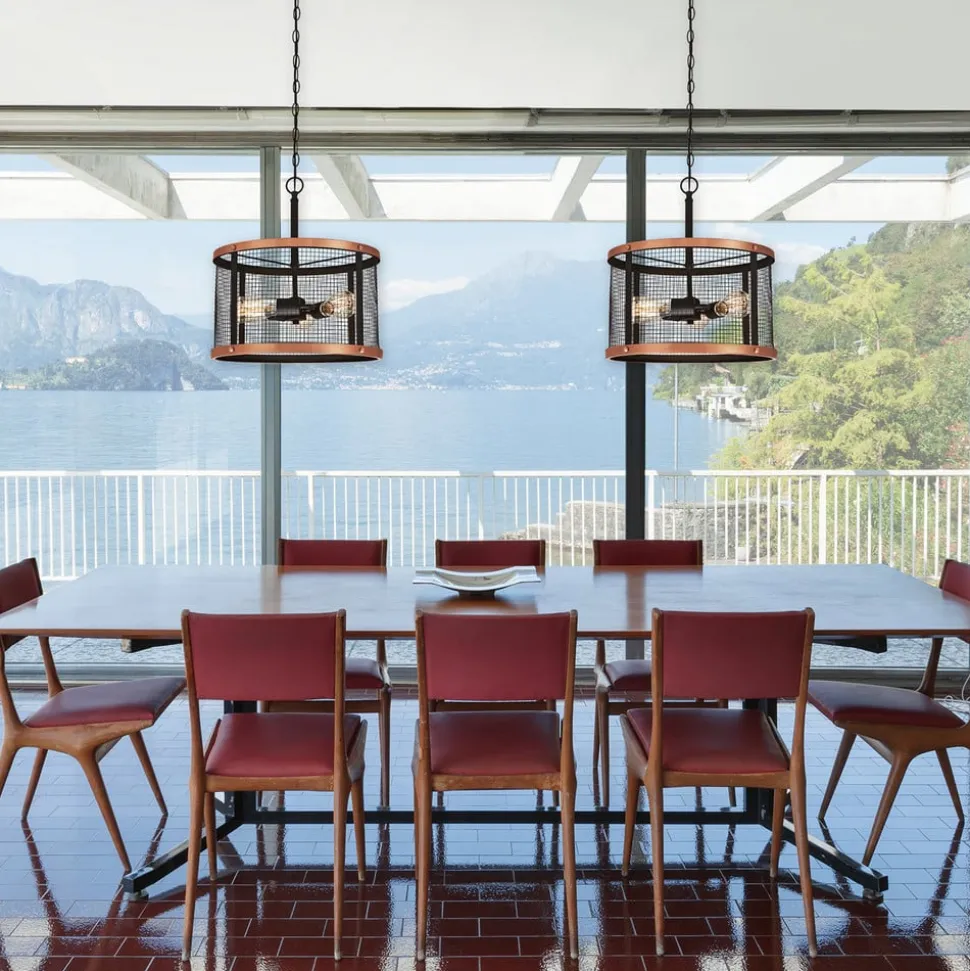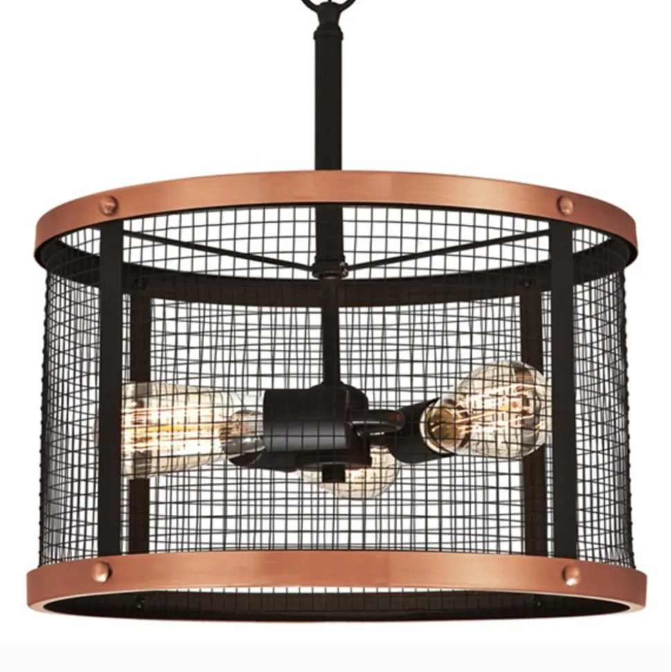 Denne usædvanlige hængende lampe Emelie overbeviser med materiale og form. Det trendy burdesign fanger straks øjet. Skyggen består af et burnet med mange firkantede masker, der giver direkte udsigt over lyskilderne. Cylindrisk og bred slutter lampeskærmen med dekorative, kobberfarvede ringe øverst og nederst, som visuelt fremhæver lampen. For at understrege pendellampe rustikke stil blev der valgt en kæde med grove led som ophæng, hvilket får lampen til at se robust ud. De synlige lyskilder drejes vandret ind i stikkene, der kommer ud fra en fælles Basis fra midten. På grund af den forskellige orientering af lyskilderne dækker lampen et stort område. Lyset kan komme ud direkte i alle retninger. Rundt det fremkalder tiltalende lys- og skyggeeffekter gennem gitteret, som giver rummet et behageligt præg. Det anbefales at vælge glødelamper, såsom rustikke lamper, på grund af lampernes direkte synlighed.