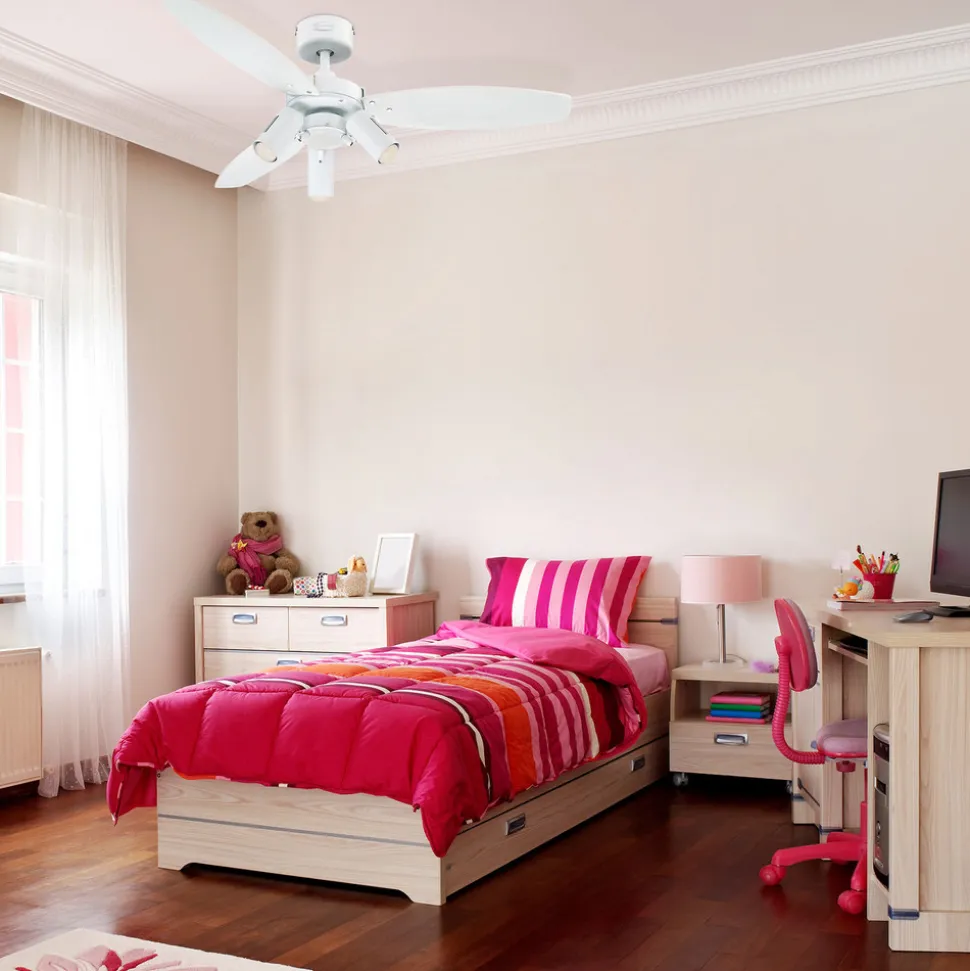 Den trebladede loftventilator Jet Plus imponerer med sit industrielt inspirerede look og tre integrerede spotlights, der skaber en omfattende belysning af rummet. Jet Plus er udstyret med vendbare vinger (hvid/lys ahorn), så du kan vælge det look, der passer til din indretning.