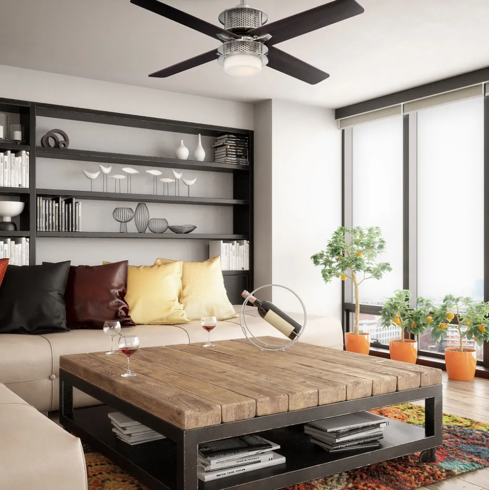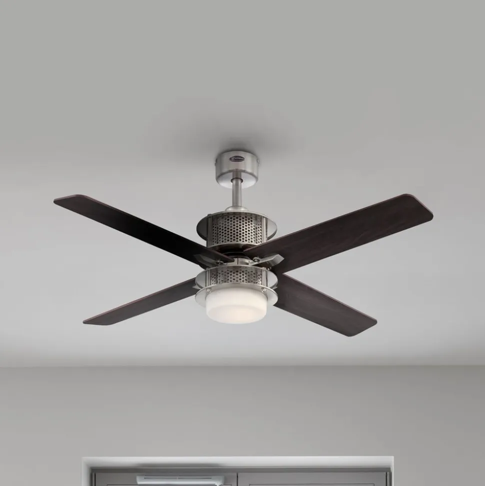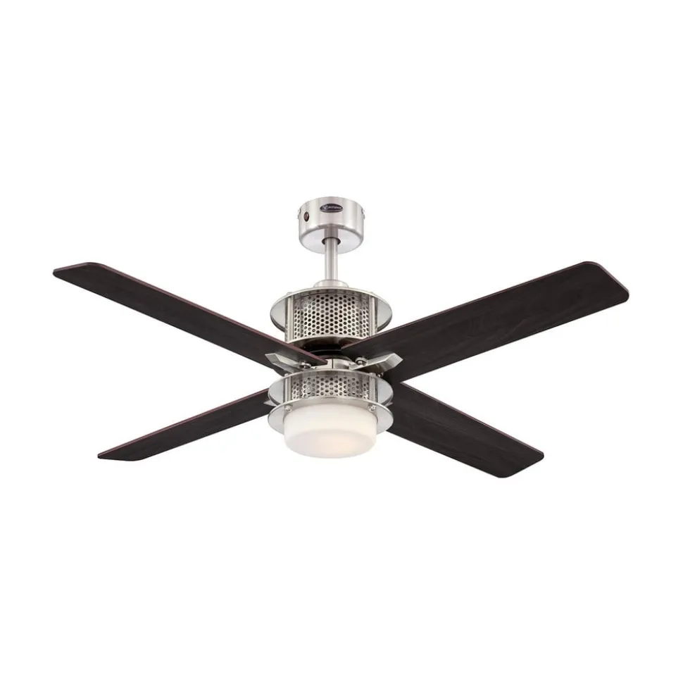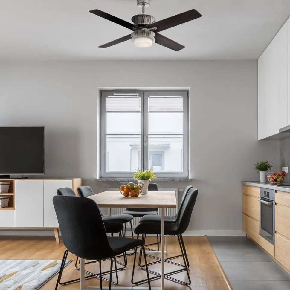 Den firebladede loftventilator Oscar tilpasser sig til indretningsstilen takket være de vendbare, tofarvede blade. I midten er der en diffusor af matteret glas med LED-lyskilde. Med sit særlige udseende passer den moderne loftventilator ikke kun til moderne interiør, men også til industrielle lofts. Inkl. fjernbetjening og to trækkontakter.