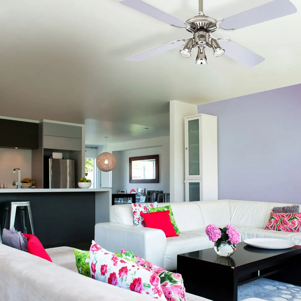 Loftventilatoren Princess Euro med fire vendbare vinger i sølv og grafit, har et tidløst elegant udseende. Den er ekstremt kraftfuld til luftforfriskning, og er endvidere udstyret med en spotlampe med 3 lyskilder.