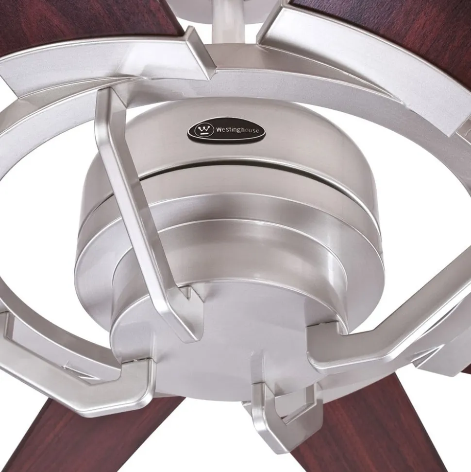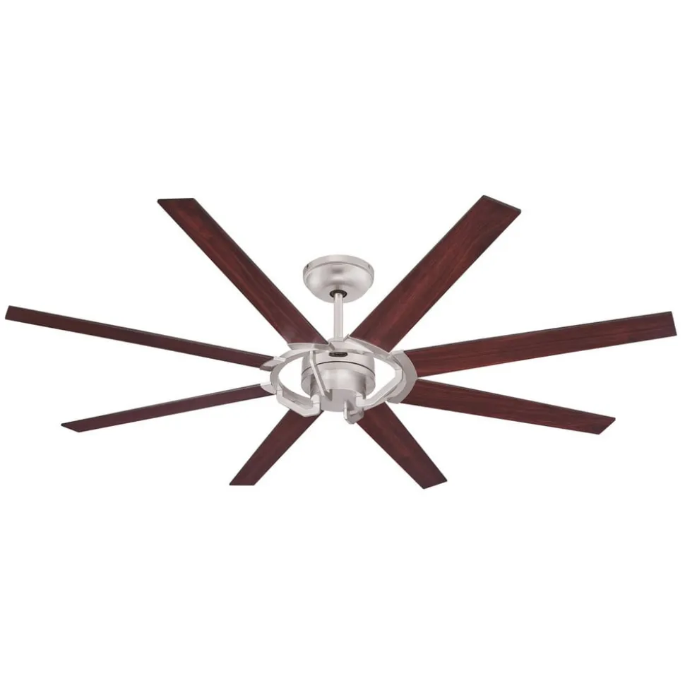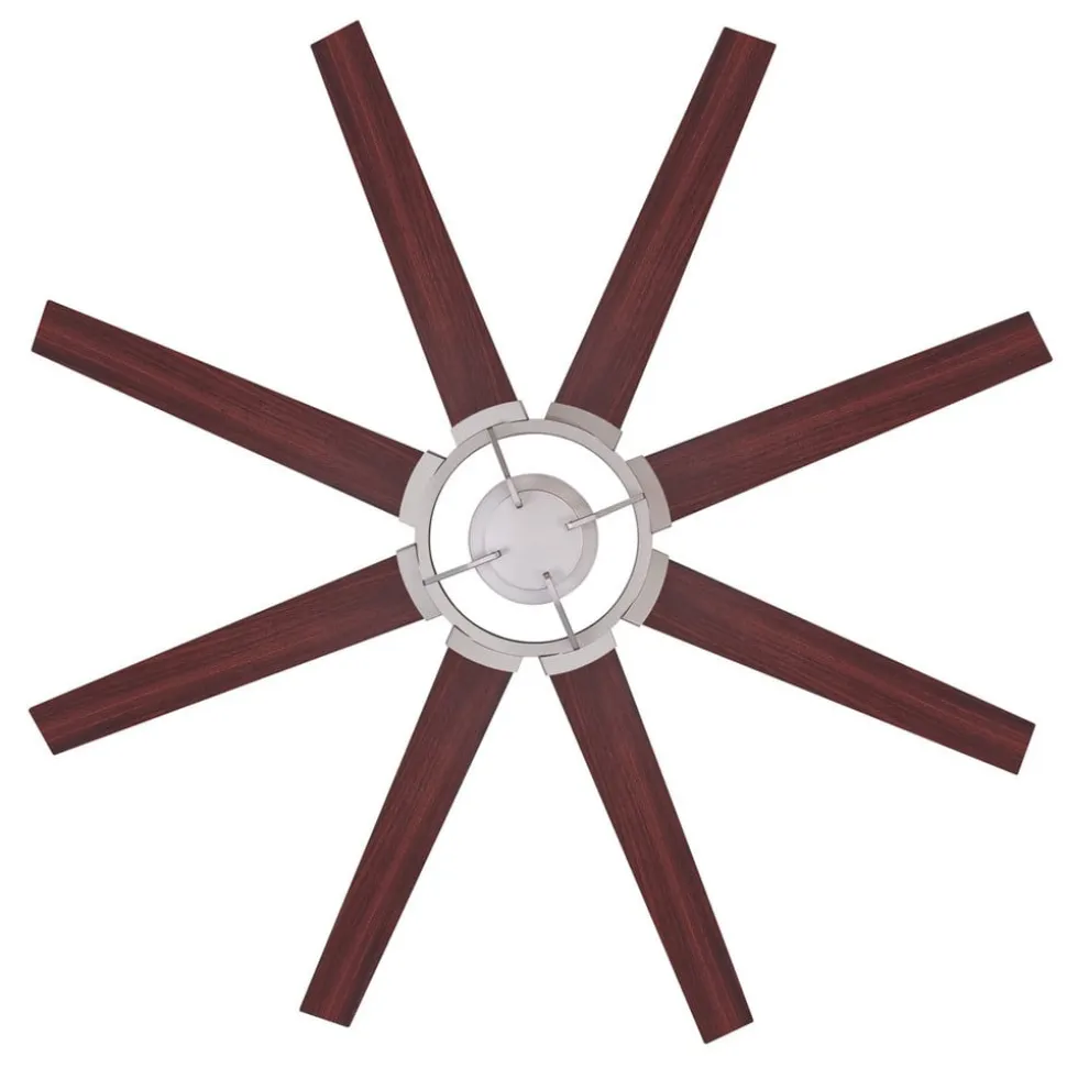 Loftventilatoren Stoneford består af et nikkelstel, der er forsynet med 8 vippelige rotorblade af træ. Hastighed, rotationsretning og justering af rotorbladene kan bekvemt styres med den medfølgende fjernbetjening.