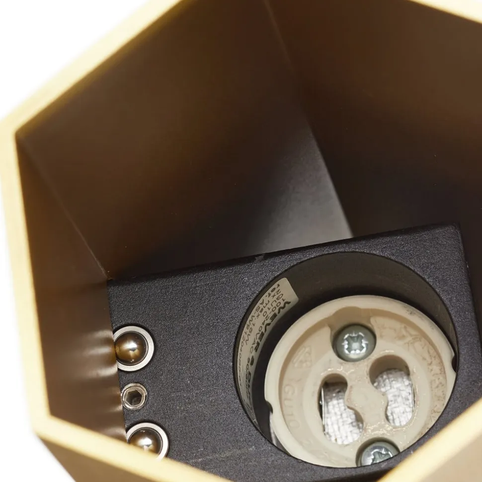 To-lampet væglampe Hexo mini 2.0 – guldfarvet Væglampen Hexo mini 2.0 stråler ikke kun med sit guldfarvede design, men skiller sig også ud med sin sekskantede form, som den har fået sit navn efter. Der er installeret to GU10-fatninger i det slanke armatur, som kan rumme alle lyskilder med en GU10-sokkel. Her anbefales energibesparende LED-lyskilder. Hexo mini udsender sit lys direkte nedad og indirekte opad, hvilket ikke kun giver en passende belysning af omgivelserne, men også skaber en hyggelig atmosfære i rummet.