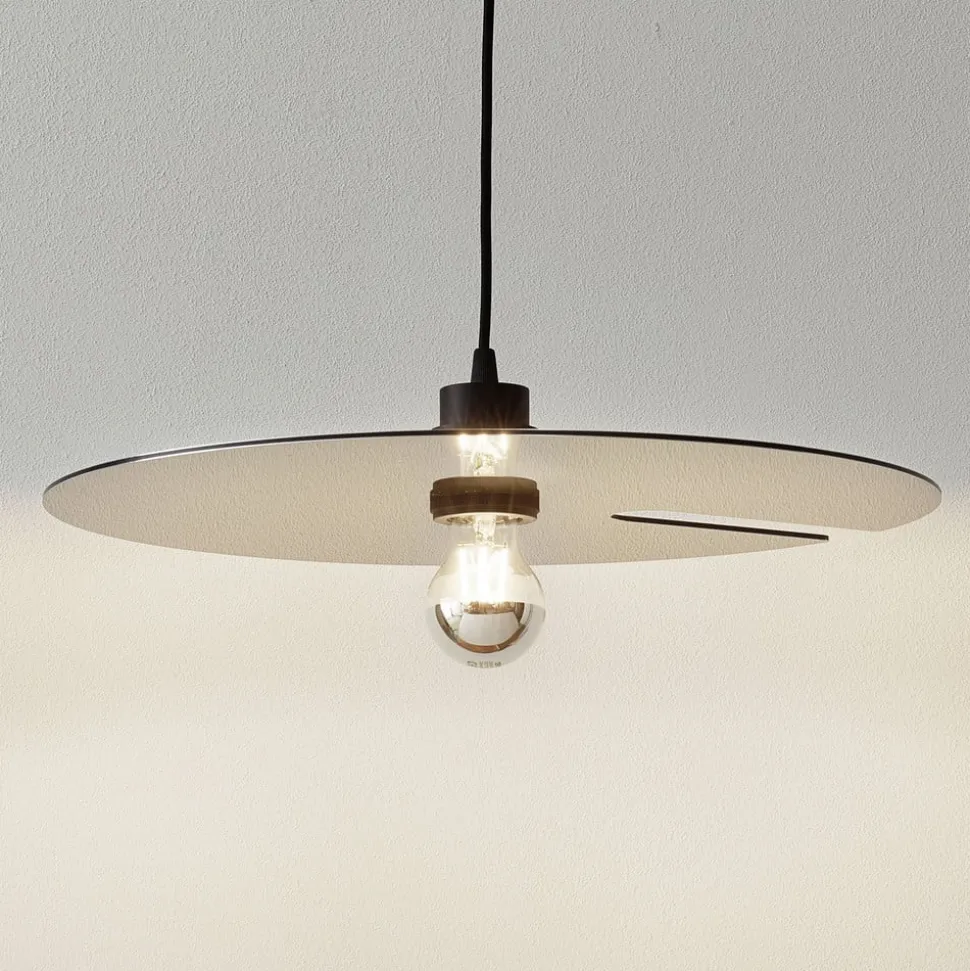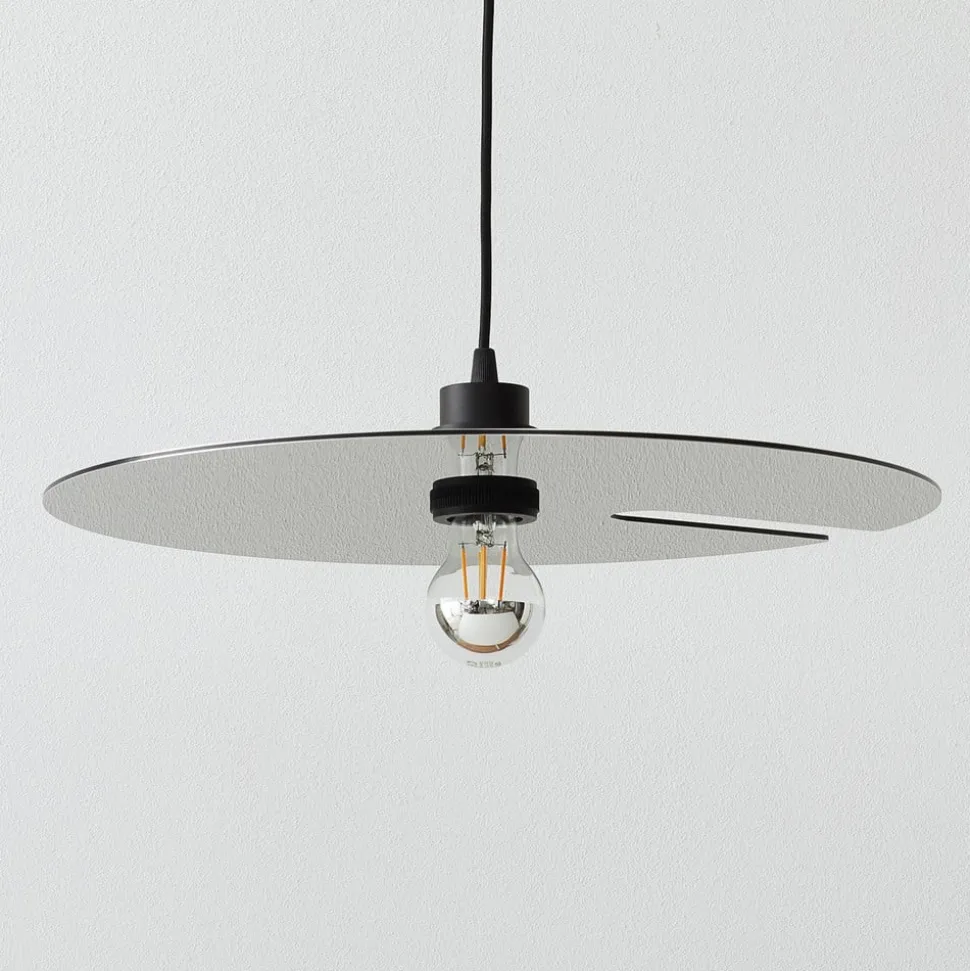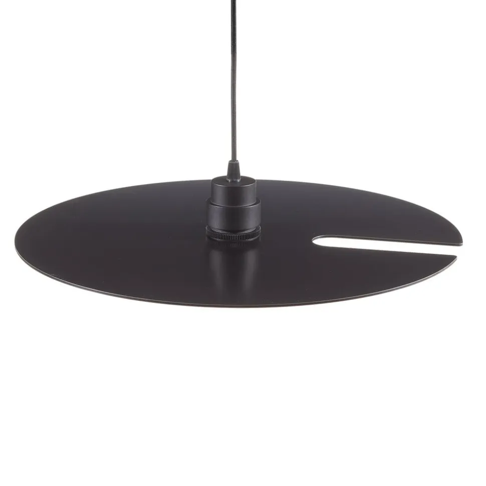Fascinerende pendellampe Mirro 2.0 – sort/krom Pendellampen Mirro, hvis skiveformede metalskærm er sortlakeret (overside) og blankt forkromet (underside), garanterer et særligt strålende lysudslip med forskellige refleksioner. Det betyder, at både den anvendte lampe og genstande under lampen – f.eks. på et bord – reflekteres i skærmen. Metalskiven er skåret ind i den ene side, så der også kan slippe lidt lys ud mod loftet. Ophængningshøjden kan kun angives, når armaturet er installeret (maks. 250 cm).