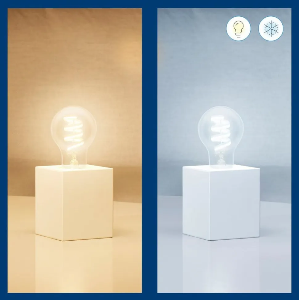 Smart styrbar WiZ E27 LED-dråbepære 6,3 W RGBW i dekorativt filament-lookSelv konventionelle armaturer, der giver et glimt af fatningen, kan smart opgraderes på en visuelt tiltalende måde med denne LED-lampe. A60-lampen i klar dråbeform er udstyret med LED-filamenter, der giver varmhvidt til dagslyshvidt lys og også utallige farvenuancer med dæmpbar lysstyrke. Disse kan justeres frit efter ønske eller vælges i form af forudkonfigurerede scener. Alle indstillinger kan foretages via appen på tabletten/smartphonen, og der er også mulighed for styring via fjernbetjening, stemmestyring og smart home-systemer.Særlige egenskaber / kompatibilitet:- over 64.000 nuancer af hvidt (varm hvid til dagslys) og 16 millioner farvede lysfarver kan indstilles- kan integreres via WLAN; bridge eller gateway er ikke nødvendig- kan styres med smartphone eller tablet med WiZ-appen- kan alternativt styres med WiZ-fjernbetjening (se tilbehør)- stemmestyring med Amazon Alexa, Apple HomeKit (Siri) eller Google Assistant mulig- forskellige app-funktioner: direkte skift, dæmpning, dæmpbar lysstyrke og dæmpbare scener. App-funktioner: direkte tænding og dæmpning, lagring af populære scener, tildeling af lamper til rum/grupper, oprettelse af tidsplaner, valg af forudindstillede belysningstilstande/scener, tildeling af flere brugere og tildeling af adgangsrettigheder, betjening af op til 10.000 WiZ-lamper