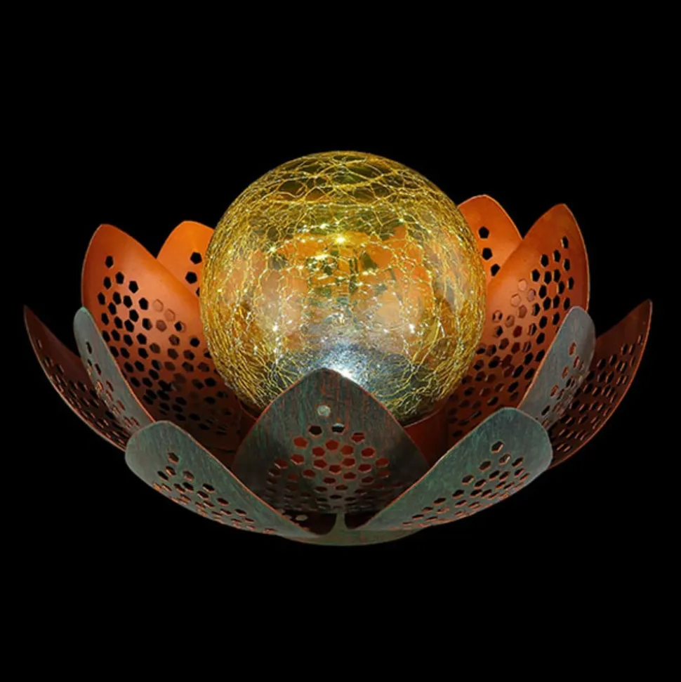 Takket være sin blomsterform er LED-sollyset særligt velegnet til placering ved havedamme eller pools, men også til alle andre udendørs steder. Den ravfarvede glaskugle inde i lygten lyser om aftenen og er indrammet af kronblade, der er ravfarvede indvendigt og grønne udvendigt. Takket være den ravfarvede inderside får lyset en ekstra varm effekt. Kuglens krakelerede udseende og de stansede blade skaber et fascinerende lysmønster i mørket. LED-lyset drives af solenergi, så der er ikke behov for en ekstern strømkilde. Den kan nemt tændes og slukkes med den integrerede afbryder. Lyset holder i op til 8 timer.