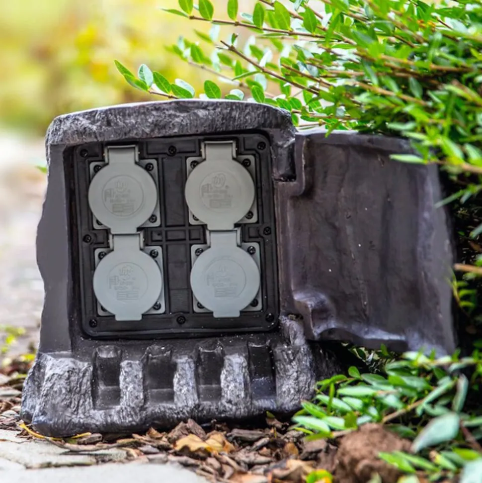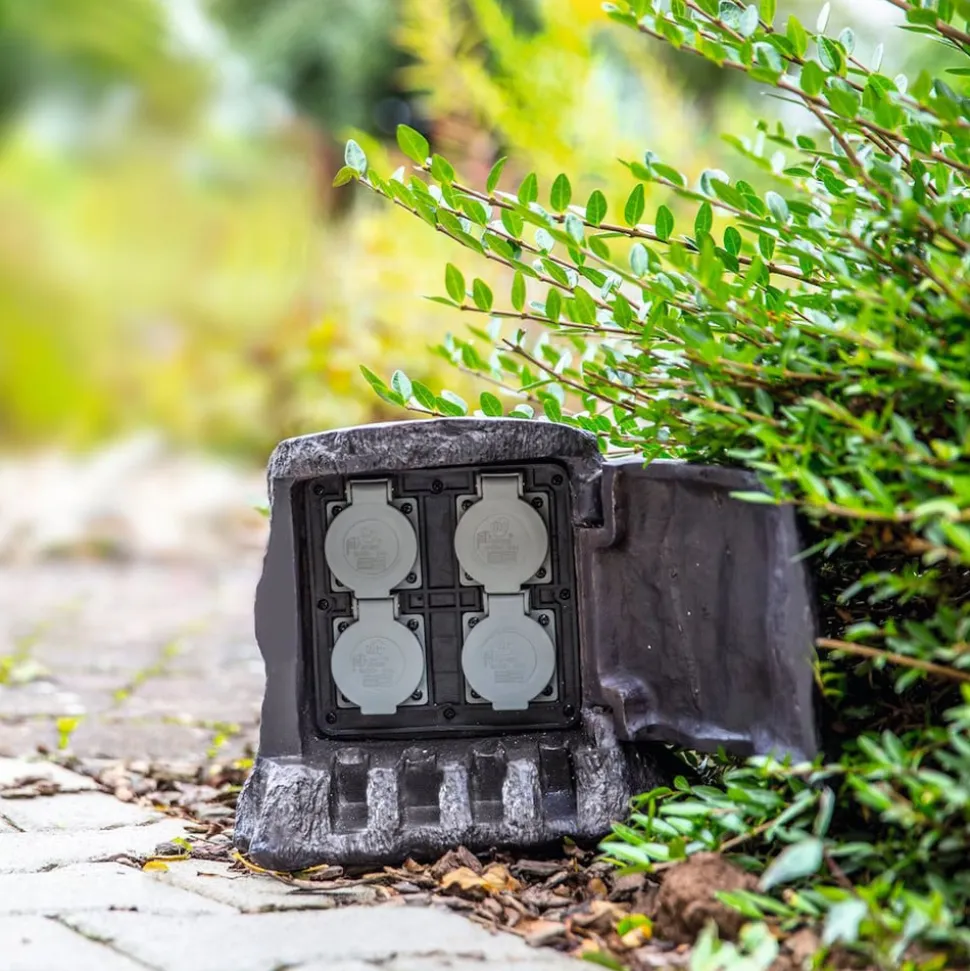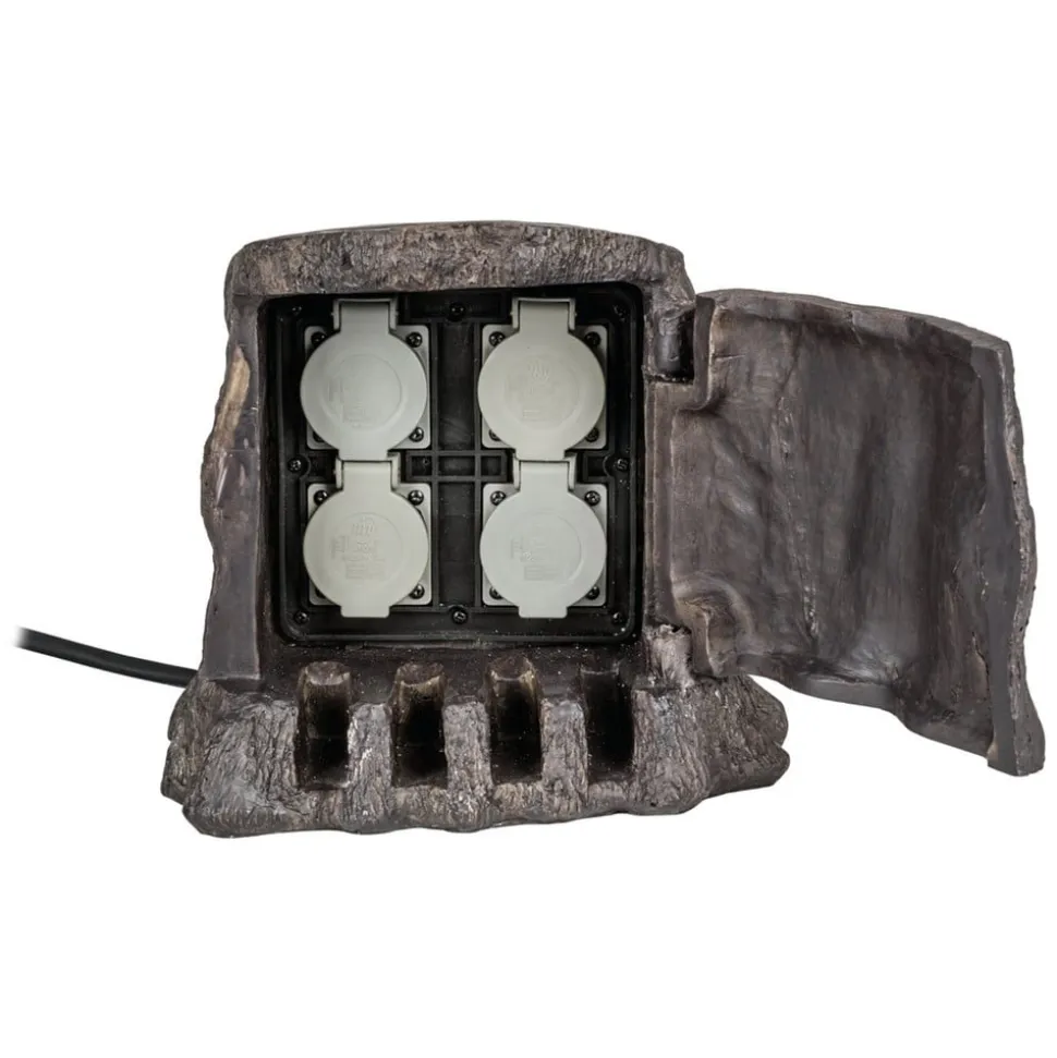 Med fire stikkontakter til tilslutning af belysning eller haveenheder, er den dekorative strømfordeler en slående ægte træstub look, et ægte blikfang. Takket være fjederlåget kan den nemt åbnes, hvormed kontakten er beskyttet mod vind og vejr, og skjult af den flotte træstub (beskyttelsesklasse IP44). Strømfordeleren leveres med et 5 meter langt kabel, og kan klare en belastning på maksimalt 3.680 W.