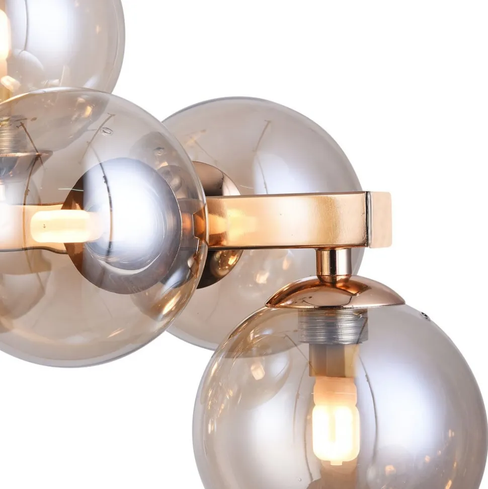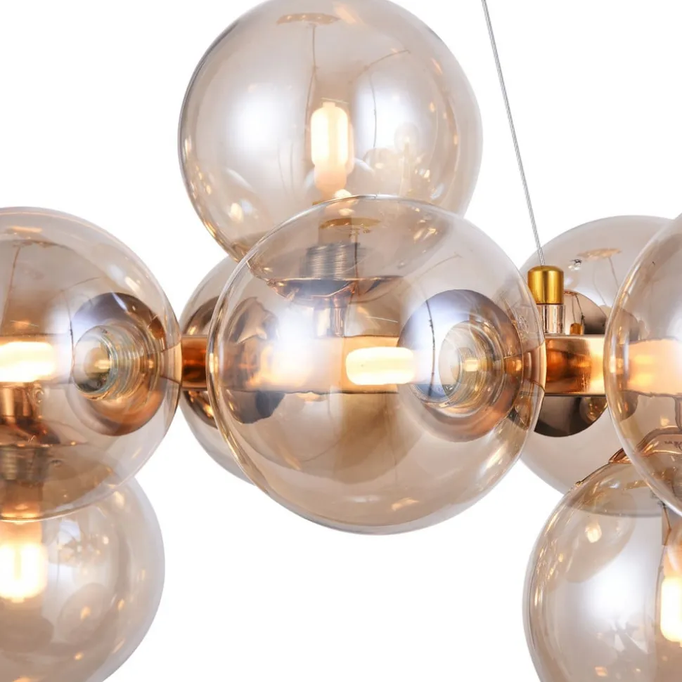 Imponerende Dallas-pendel med kugleformede glas i guldDallas-pendellampens aflange skærm består af en guldfarvet lakeret metalstang, hvorpå der er fastgjort i alt 25 kugleformede lampeglas, som peger i alle retninger. Det guldfarvede tonede glas skaber en meget harmonisk, blød lysatmosfære. Lyseffekten fra denne ekstravagante pendel er fænomenal: festlig, hyggelig – ganske enkelt stemningsfuld, lige det, der skal til for at oplyse f.eks. et langbord tilstrækkeligt.