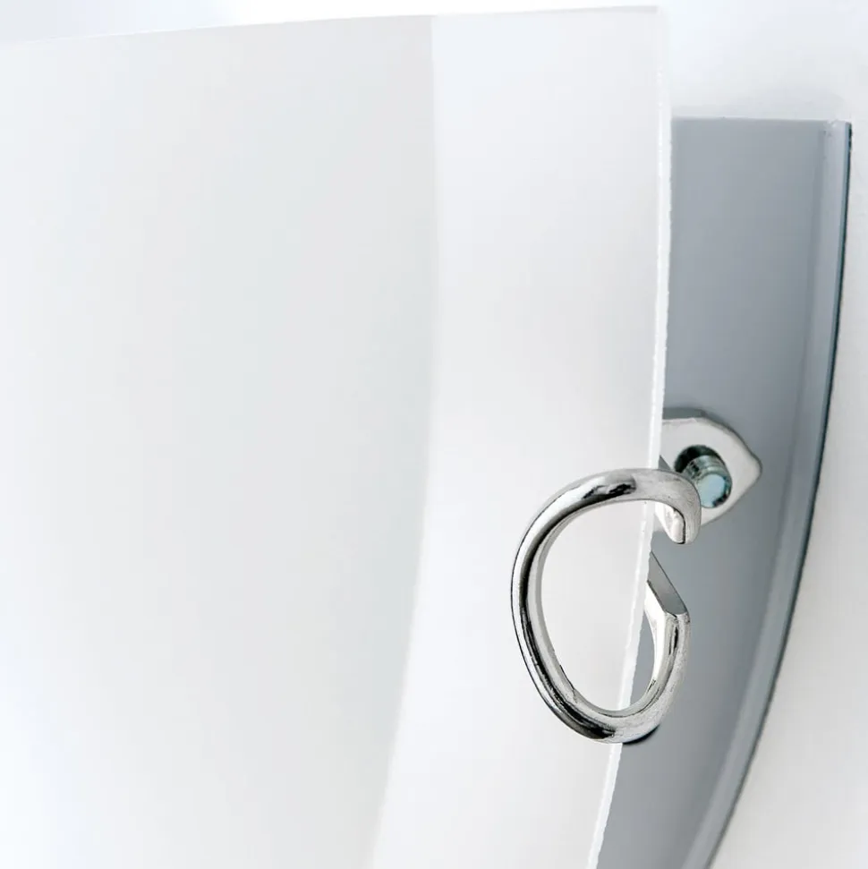 Agada opalglas-væglampe i halvcirkelform Agada-væglampen er defineret af en halvcirkelformet skærm af opalglas, der åbner sig opad. Små dele af stålholderen er synlige på siderne, hvilket giver væglampen moderne kromaccenter.