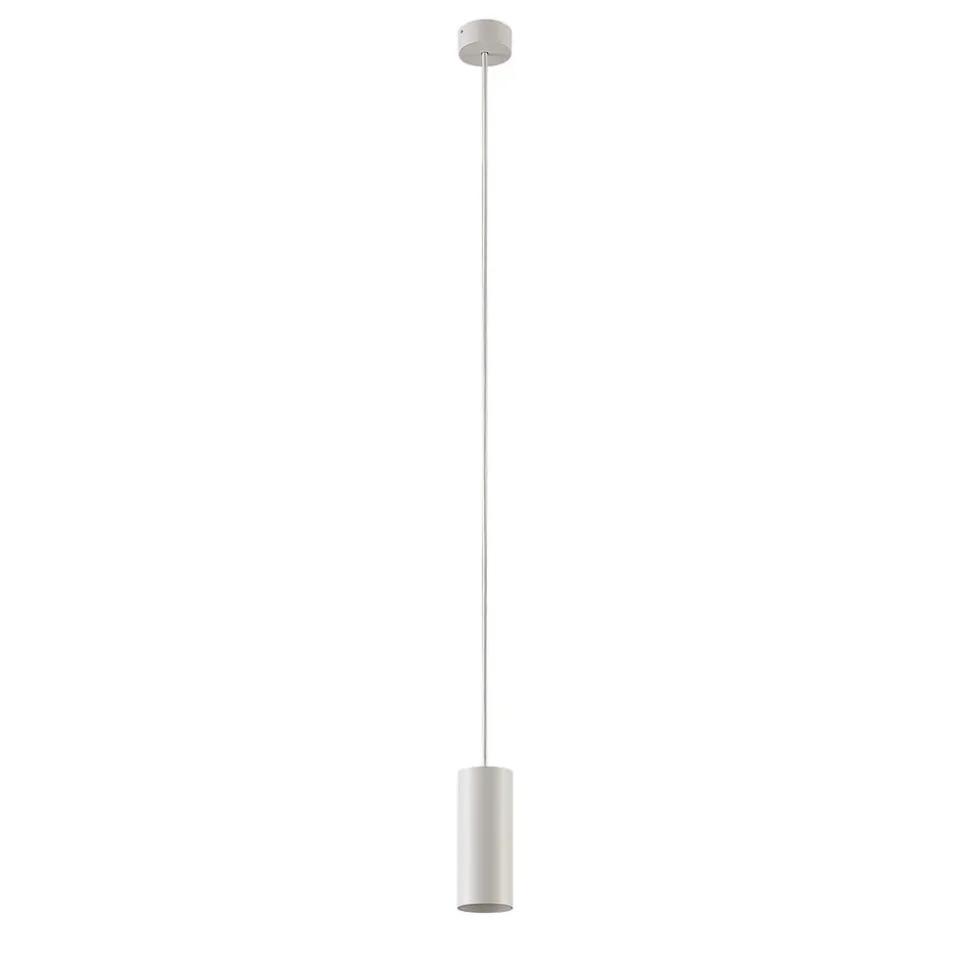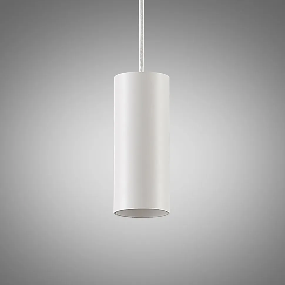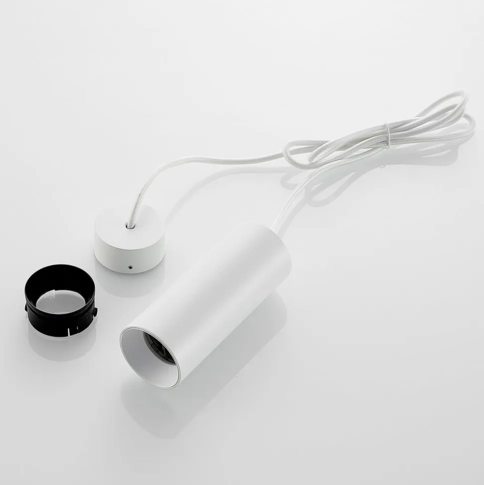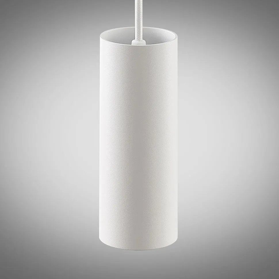 Cylindrisk pendellampe Ejona i hvid, ekstra reflektorpære i sort medfølger Ejona er et iøjnefaldende belysningsobjekt i moderne stil med en cylindrisk form, en lampeskærm i aluminium og en mat hvid overflade. Den anvendte GU10-lyskilde udsender lyset nedad som et spotlight, og afhængigt af rummet anbefales det at bruge flere pendellamper i træk for at forbedre lyseffekten, f.eks. ved belysning af en disk. En ekstra reflektorpære i sort er inkluderet for at skabe en flot kontrast til den hvide finish.