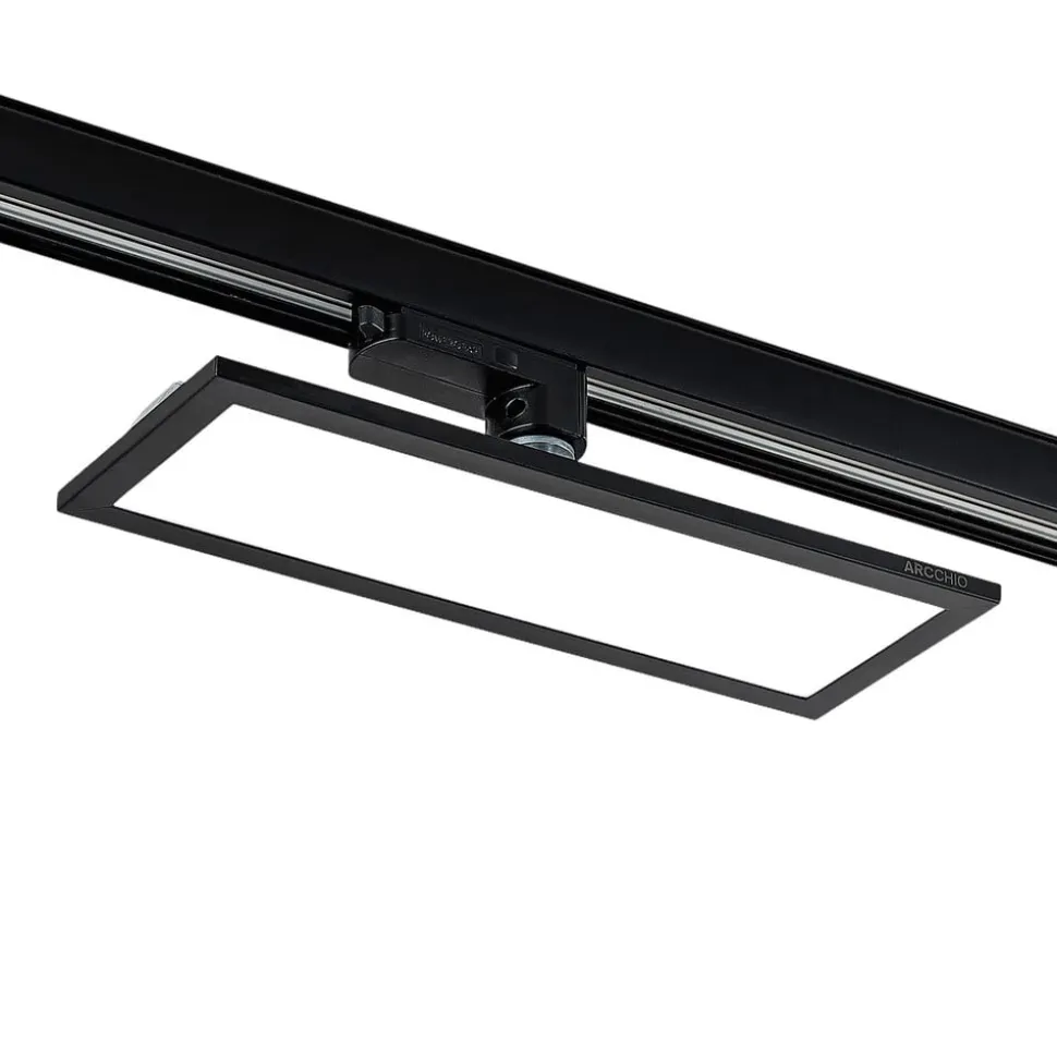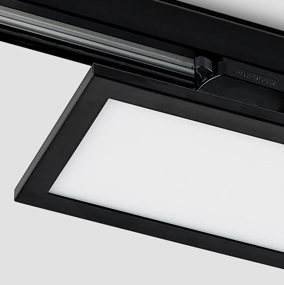 Rektangulært Hairis LED-panel med sort kant til brug på en 3-faset skinne Dette LED-armatur i form af et aflangt, rektangulært panel er designet til montering på et 3-faset skinnesystem og er udstyret med et led, så den belyste overflade kan drejes efter behov for bedre at tilpasse lysudsendelsen til omgivelserne på stedet. Den 3-fase skinne, som panelet er monteret på, kan også være placeret i et kommercielt miljø. Især her, f.eks. i en butik, har man fordel af de muligheder for skræddersyet lysdesign, som en strømskinne giver, fordi man kan kombinere forskellige lyskilder på en gennemtænkt måde. Hairis LED-panelet genererer et passende stærkt lys med et lavt strømforbrug. Aluminiumsrammen omkring den hvide lysende overflade, som muliggør en særlig ensartet lysfordeling, har en sort overfladefinish – UGR 28,9 – SDCM < 4
