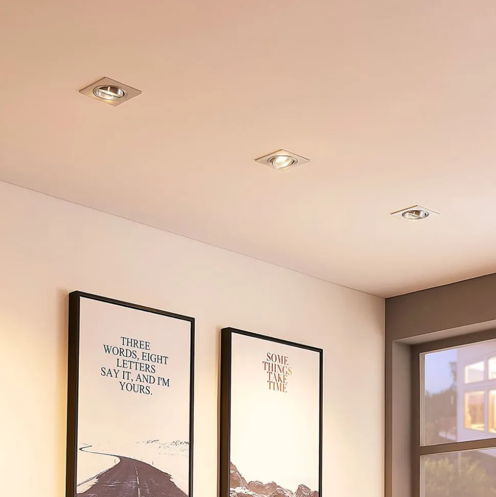 Kantet indbygningsarmatur Sophia i aluminium Den kantede krop på dette indbygningsarmatur suppleres i midten af en rund lyskildeindsats, som er bevægelig i stedet for fast. Den kan vippes op til 25°, så lysretningen kan justeres bedre. Med sin overflade i børstet aluminium passer Sophia indbygningsarmatur til mange stilarter.