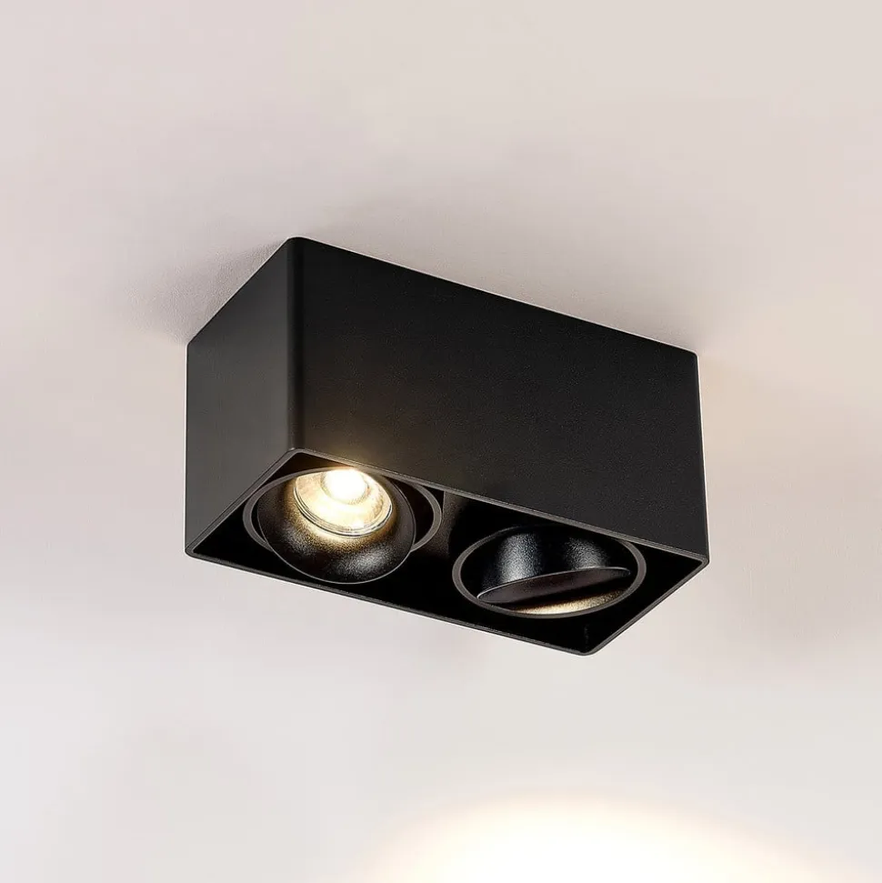 2 lyskilder loftlampe Kubika af aluminium Den rektangulære loftlampe Kubika imponerer med sit minimalistiske design og klassiske farvevalg. Huset er lavet af aluminium og har en sort finish. Det har plads til to GU10-fatninger, der passer til matchende reflektorpærer. Med en direkte nedadgående stråleretning sikrer reflektorpærerne en ensartet og blændfri lysfordeling. Dette armatur er ideelt i kombination med andre lyskilder fra samme serie – ikke kun i private boligområder, men alternativt også i hotel- og cateringsektoren.