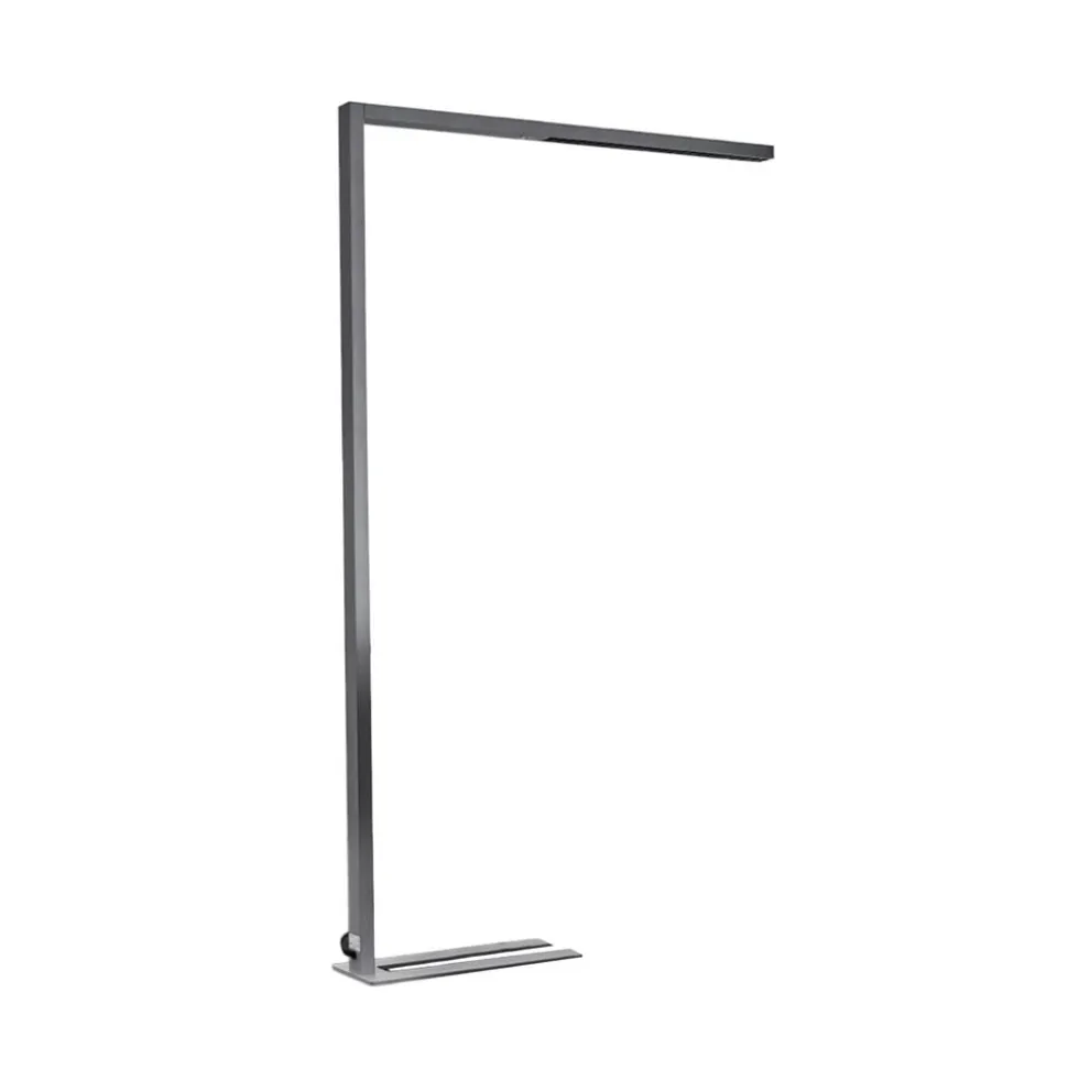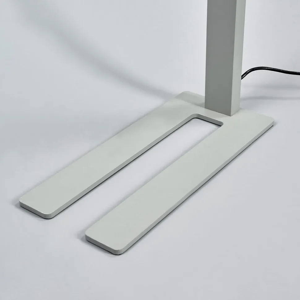 Funktionel LED-gulvlampe til kontor Jolinda med dagslyssensor, bevægelsessensor, dæmper og direkte/indirekte belysning Jolinda har et minimalistisk, meget moderne udseende, da gulvlampen stort set kun består af to smalle bjælker, der er placeret i rette vinkler i forhold til hinanden. Lyset skinner opad og nedad, stort set uden at blænde nedad, hvilket giver en meget behagelig lysoplevelse, som er perfekt til lange perioder med koncentreret arbejde ved skrivebordet. LED-gulvlampen er velegnet til at oplyse et skrivebord, som så forsynes med stærkt lys. Det høje funktionsniveau skal også nævnes, da Jolinda ikke kun har en dæmpningsfunktion, men også styres via en dagslyssensor og en bevægelsessensor. Efter 30 minutters fravær slukker armaturet af sig selv, og dagslyssensoren sikrer en relativt konstant lysstyrke i rummet, fordi lyset fra LED-gulvlampen bliver lysere eller mørkere afhængigt af lysstyrken udenfor – med U-formet fod – UGR < 6 Armaturerne er optimeret til at give en ideel, blændfri og ensartet belysning til et standardskrivebord på 160 cm x 80 cm. Det anbefales derfor at bruge én lampe pr. skrivebord.
