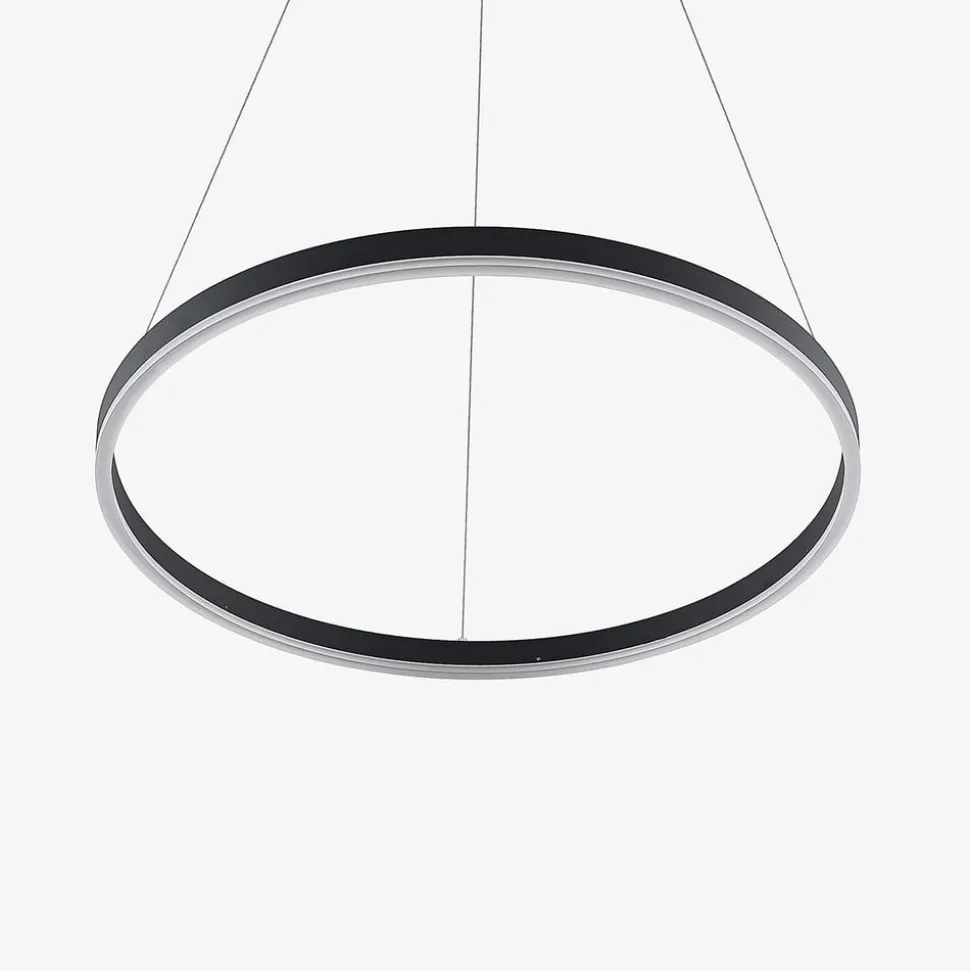 Albiona ringformet LED-pendellampe i sort – perfekt til køkkener og spisestuer Albiona er en lyskilde, der med sin moderne, minimalistiske ringform ser særligt stilfuld ud i moderne interiører. Pendellampen strækker sig ud i rummet på tre filigrane ledninger og domineres visuelt af den sorte metalring, på hvis underside de lyse, effektive LED’er er indlejret og giver et varmhvidt, hyggeligt skær. Stilfuldt design med et særligt udtryk!