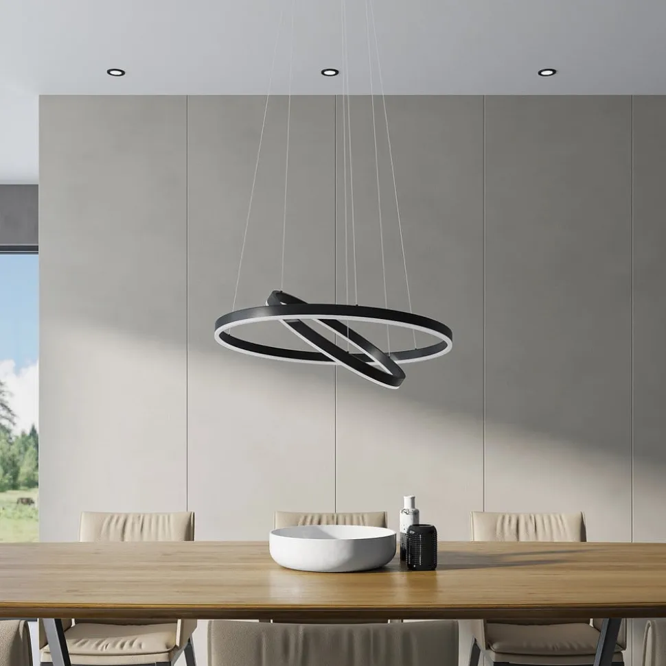 Sort Albiona LED-pendellampe lavet af to ringe på filigrantrådkabler Albiona er en LED-pendellampe, der er ideel til at belyse et spisebord og er af særlig god udførelse og lysstyrke. Armaturet er i stand til at oplyse en spiseplads kraftigt og give varmhvidt lys. Ringene er ikke kun farvet matsorte og lavet af aluminium, men er også arrangeret i en vinkel, så de minder om planeternes baner i rummet. Designet er enkelt og minimalistisk, men har alligevel en passende tilstedeværelse i rummet og er forbundet med en stilfuld lyskilde med et moderne udtryk.