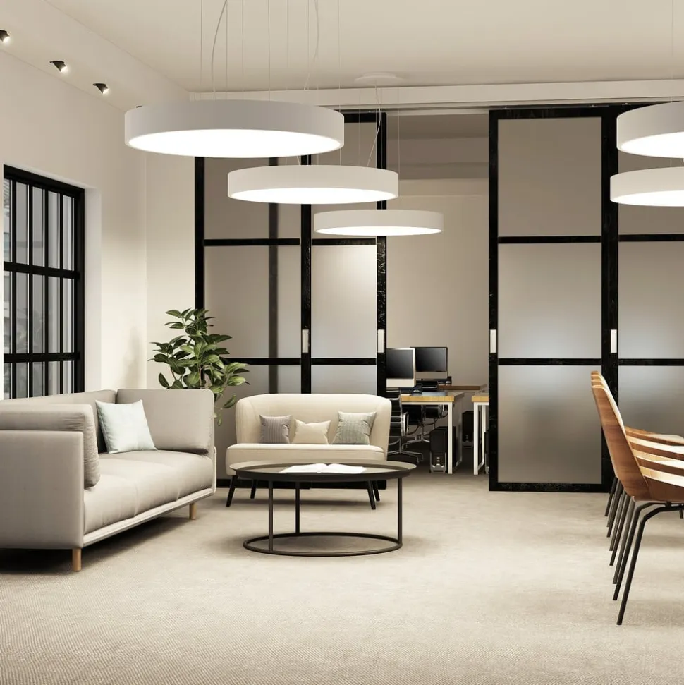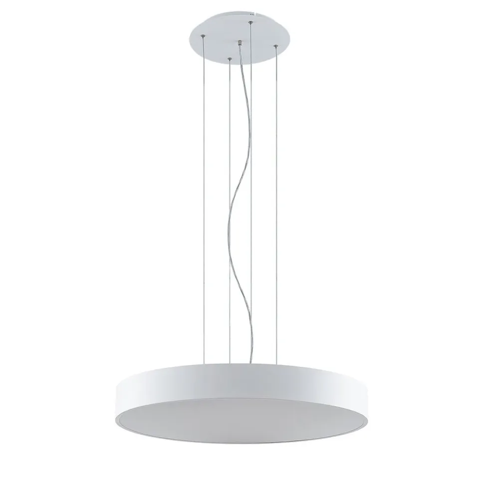 Stor, hvid Noabelle LED-hængelampe med wireophæng og DIP-kontakt til indstilling af lysfarve Noabelle er helt hvid, hvilket skaber et harmonisk look, især fordi det overordnede design er minimalistisk og moderne. Hængelampen har også meget at byde på rent teknisk med sin kraftige, energibesparende LED-teknologi, som sikrer god belysning af bolig- og erhvervsområder uden højt energiforbrug. Tværtimod er forbruget særligt lavt takket være det høje lysudbytte. En anden fordel er, at du kan vælge mellem to lysfarver via en DIP-kontakt under installationen, så den tilsigtede brug ikke bestemmes af farvetemperaturen. Du kan vælge mellem hyggeligt lys i varmhvid eller universalhvid, som er mere velegnet til arbejde. Den runde form har et enkelt udseende, men Noabelle LED-hængelampen har ret store dimensioner, så den bestemt har en vis tilstedeværelse i rummet. Det fine ophæng af tre ledninger afrunder effektivt designet og giver det en vis lethed, som også udstråles af den hvide overflade.