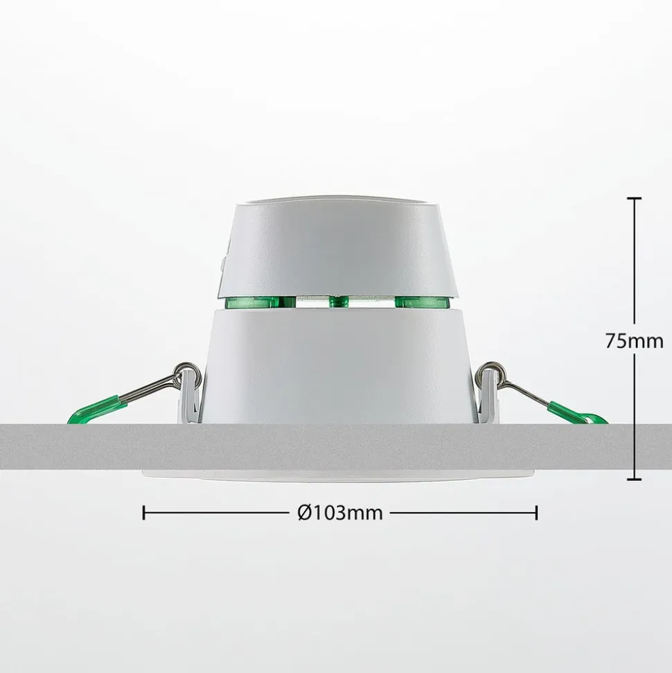Katerin er en meget nyttig LED-indbygningsspot, der kan lyse i tre lysfarver. Før montering og indsætning i loftet kan man vælge mellem tre lysfarver, som derefter kan styres via en DIP-kontakt på kabinettet. I midten af det hvide lampehus sidder lampekroppen, der kan drejes op til 25°, så man bedre kan bestemme lysudgangen. Lysstrålen udgår i en ret smal vinkel på 36°, så der skabes et overvejende punktformet lys, og enkelte objekter eller områder kan belyses målrettet.