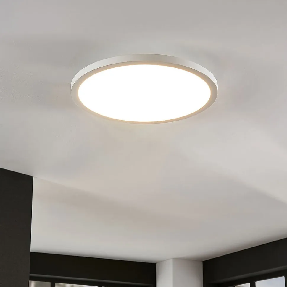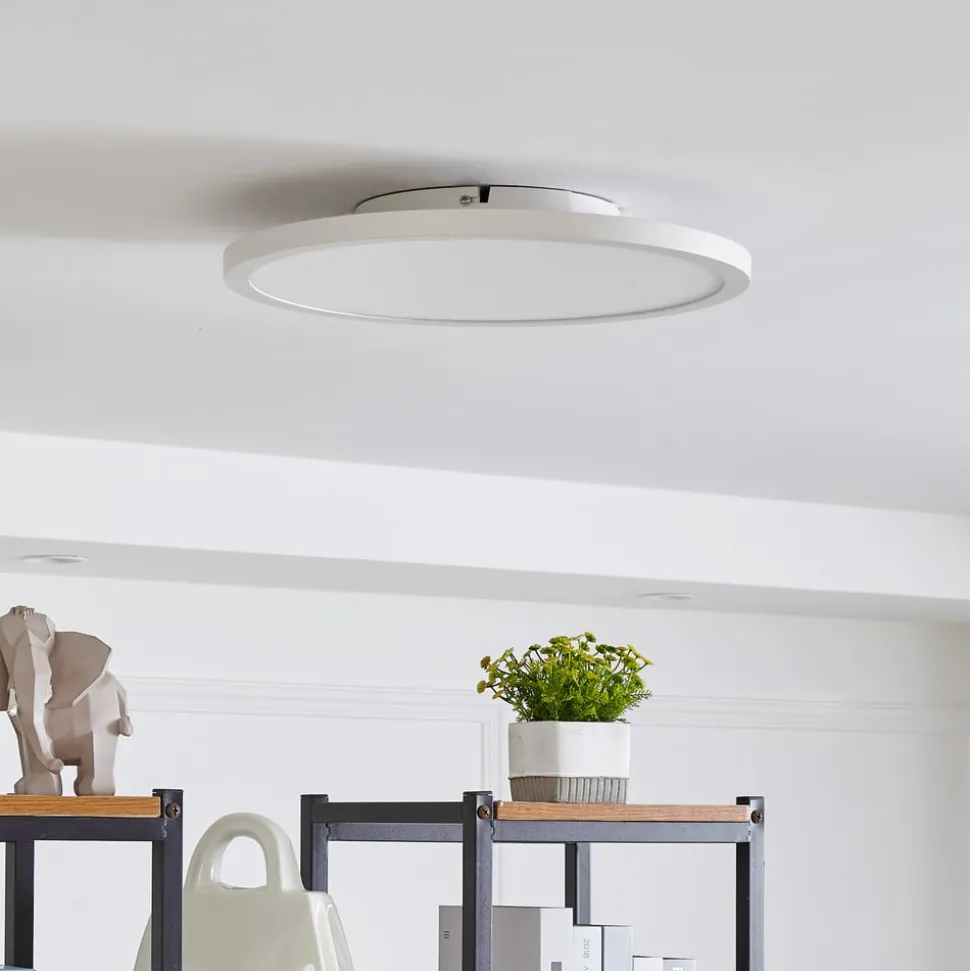 Den runde LED-loftlampe Brenda: skiftende lysstyrke og farvetemperatur takket være fjernbetjening Takket være sin lave dybde kan denne LED-loftlampe forhindre rummet i at se mindre ud og samtidig give et cool, moderne udtryk. Offentlige rum, lægepraksisser og puristiske stuer fremhæves perfekt. Den runde form og den hvide metalramme skaber tilsammen et sofistikeret look uden at trænge sig på. Farvetemperaturen kan ændres via en fjernbetjening, uden at man behøver at røre ved lampen Direkt. Samtidig sikrer en dæmpningsfunktion inklusive natlampe-tilstand passende lysstyrke på alle tidspunkter af dagen. Dette gør Brenda loftlampen til en allround pragmatisk lyskilde. Tekniske detaljer: – med skrueløs hurtigkoblingsterminal af høj kvalitet (holdbar, sikker og værktøjsfri fjedermekanisme) – med CCT-farveskiftfunktion til ændring af lysfarven – integreret natlystilstand – indbygget dæmpningsteknologi – funktioner kan styres via fjernbetjening