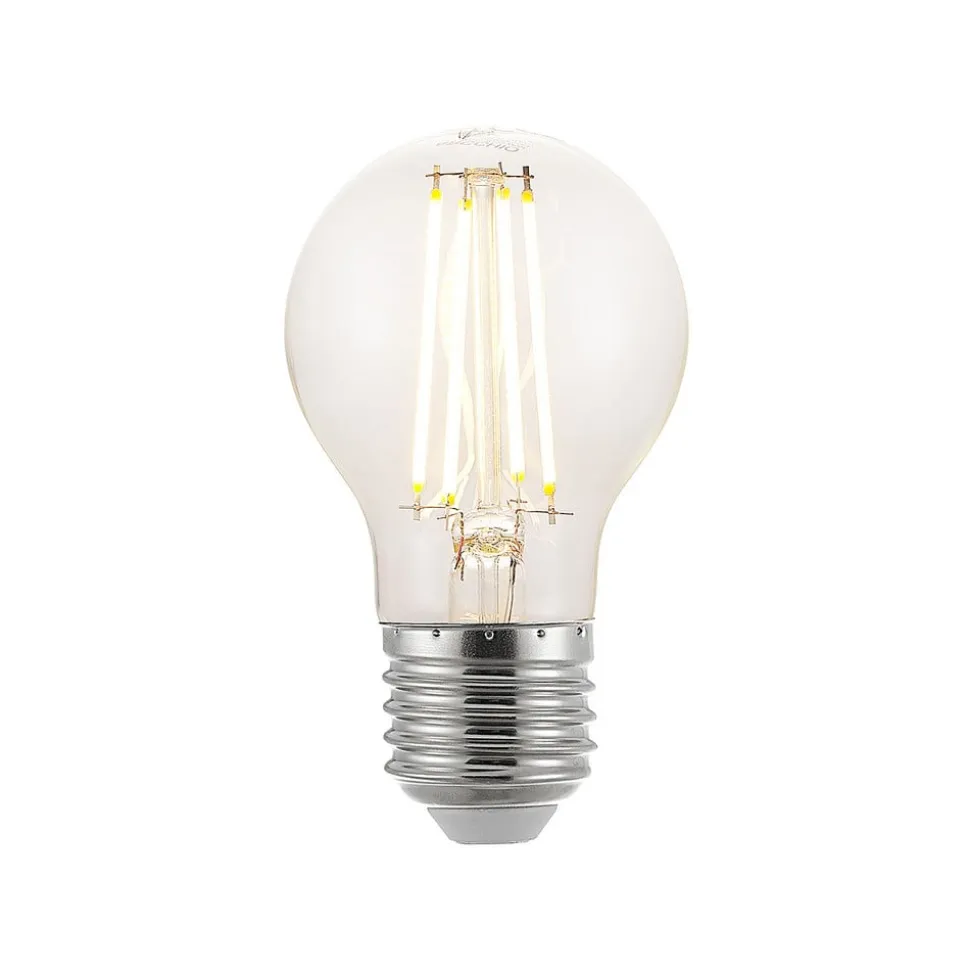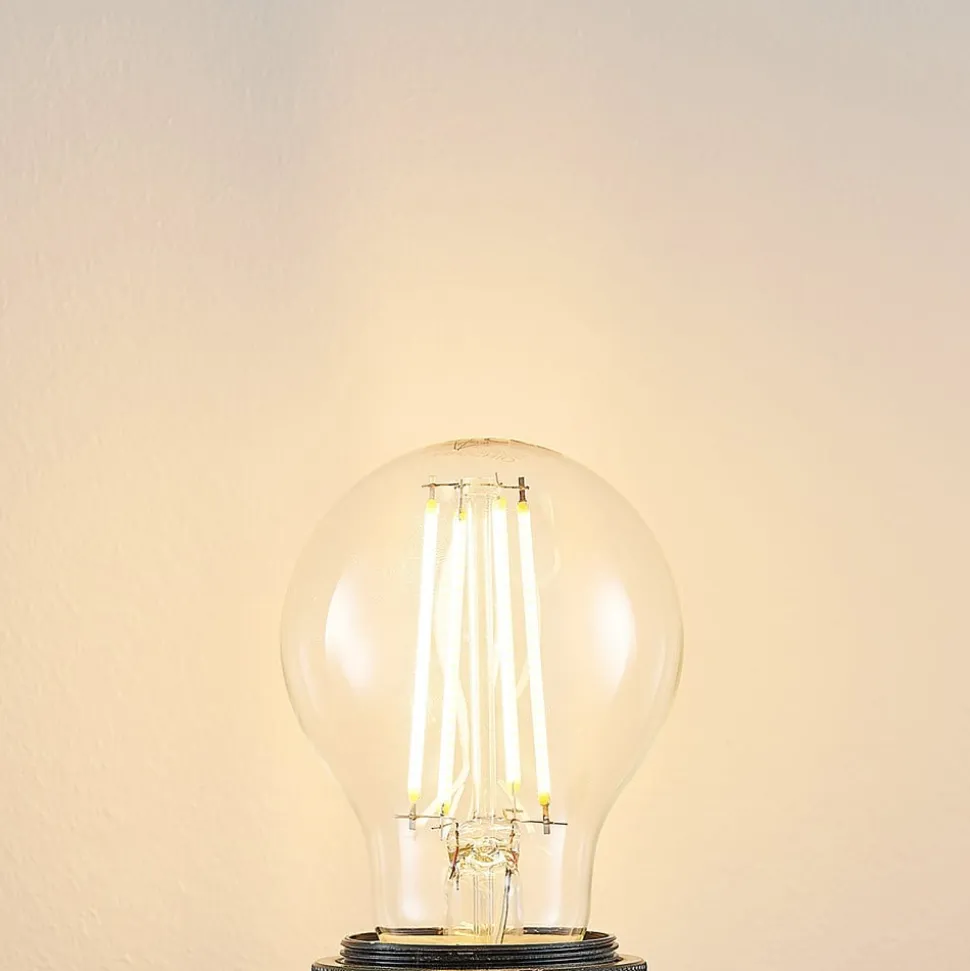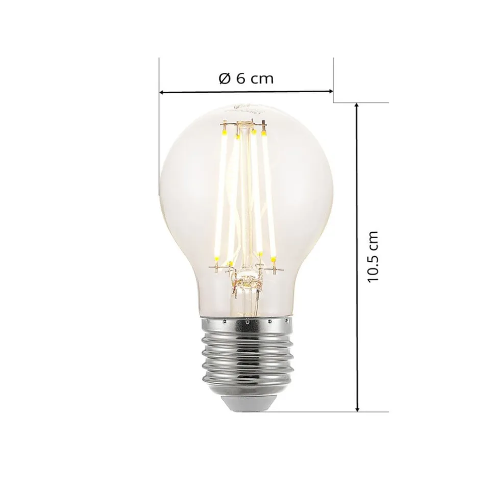 LED-lampe E27 filament klar, varmhvid, dæmpbar Denne klare LED-filamentpære er en dekorativ erstatning for traditionelle glødepærer på 60W i mange eksisterende armaturer. Lampens lysstyrke kan indstilles til tre niveauer (100%, 55%, 20%) ved hjælp af vægkontakten uden behov for en ekstra dæmper.