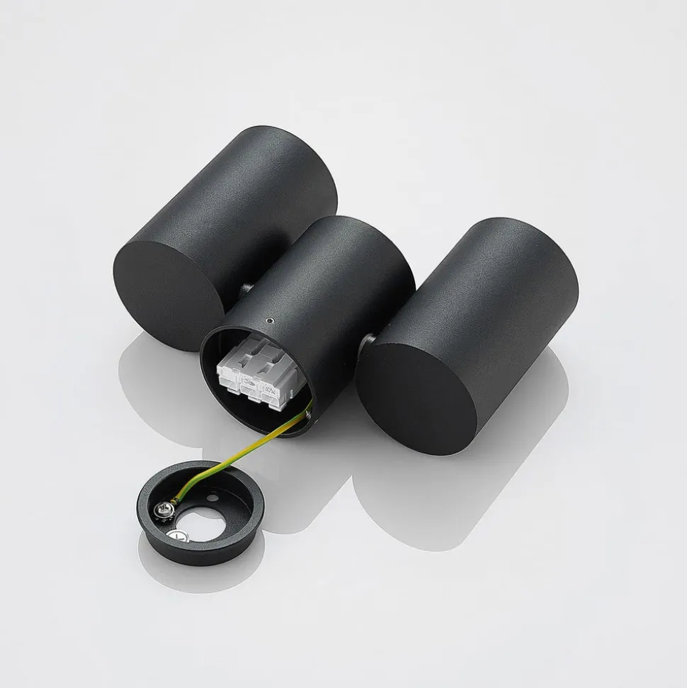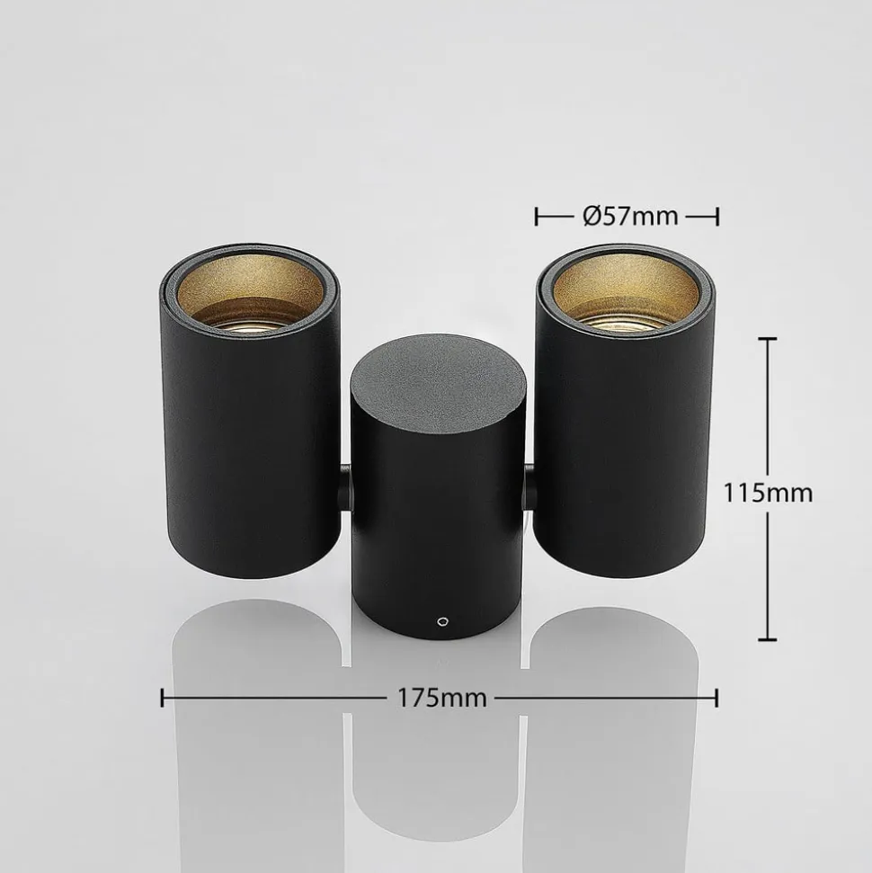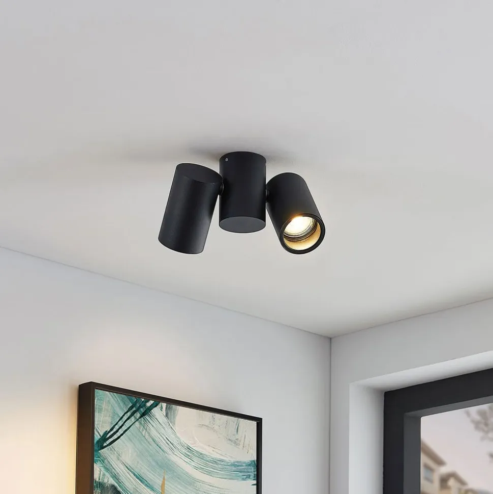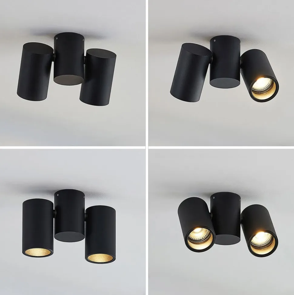 Gesina 2 lyskilder LED-spotlight med sort overflade og drejelige skærme LED-loftlampen Gesina har tre cylindriske elementer, hvoraf to er skærmene, og det midterste er loftbeslaget. Da hvert lampehoved kan drejes, kan lysmønstret justeres efter behov for at belyse de ønskede områder i rummet. Den sorte finish har et diskret udseende og passer godt til moderne boligstile. Lampen kan bruges i et køkken, en gang eller et opholdsrum.