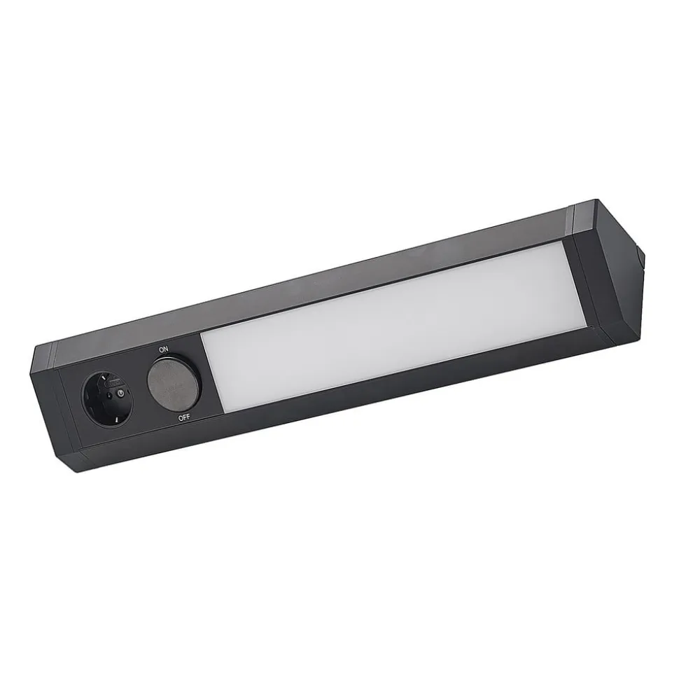 Mitari LED-underskabsbelysning skabslampe er lavet af aluminium og har et hvidt plastdæksel, der gør det muligt for lyset at stråle jævnt til omgivelserne. Huset var dækket med en sort finish og giver lampen et slående look. Det specielle ved Mitari er det integrerede stikkontakt, som kan bruges til at oplade enheder og er meget praktisk i arbejdsområdet. De varmhvide lysdioder sparer strøm og udsender et behageligt lys, der kan sprede sig vidunderligt på bordpladen nedenunder.