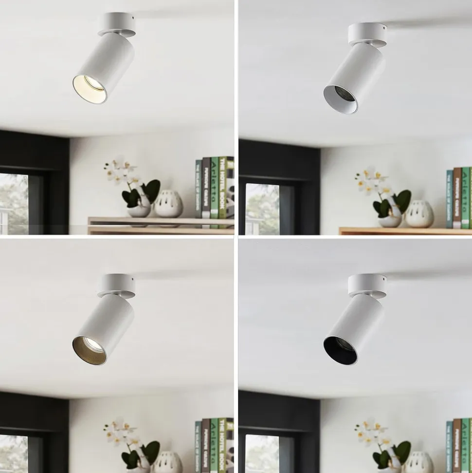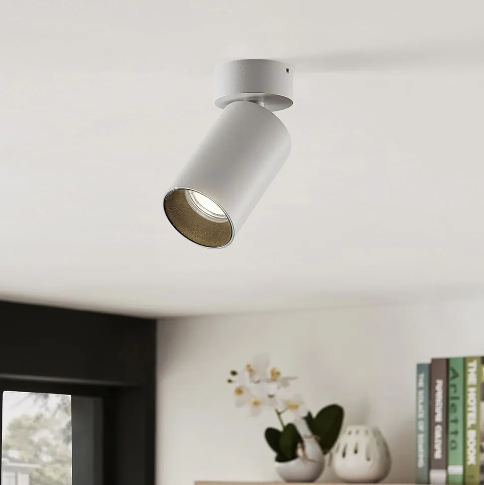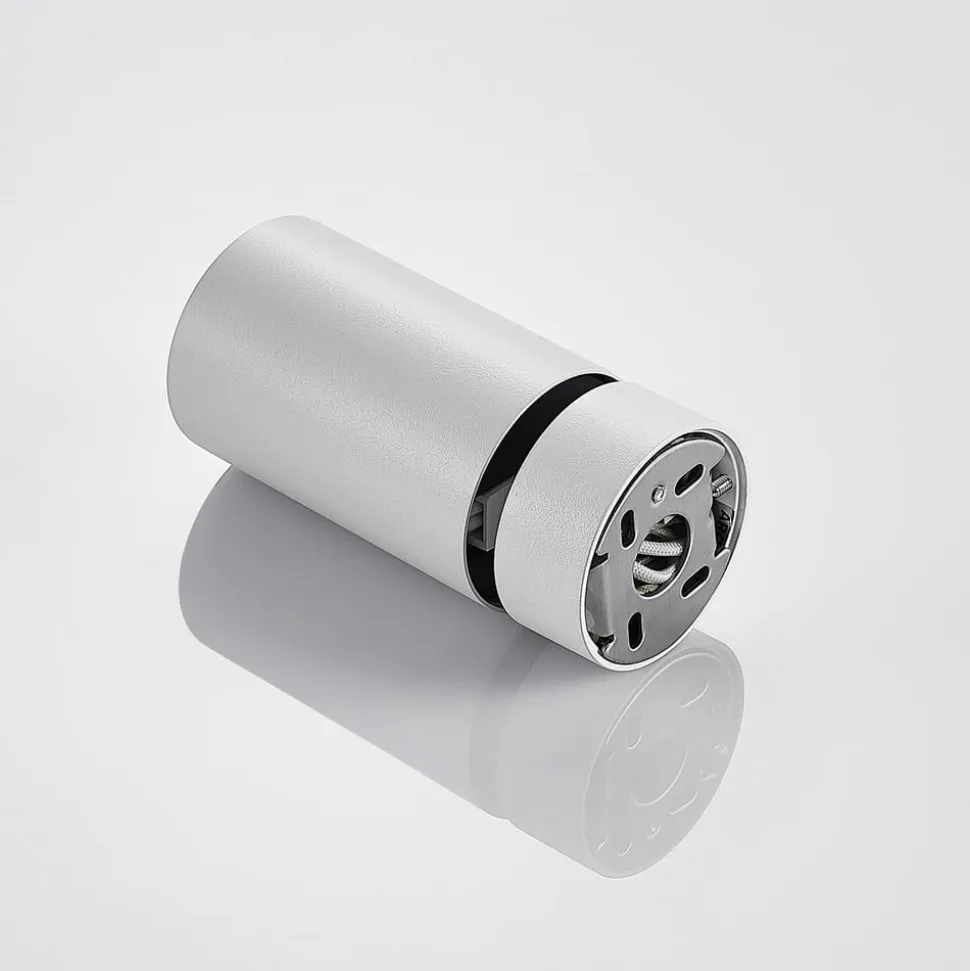 Hvid Brinja spotlight af aluminium i et praktisk sæt med 2 Helt i hvid imponerer Brinja spotlight med sit enkle, men elegante design og sætter ethvert rum i det rette lys. Uanset om det er i gangen, stuen eller arbejdsområdet – lampen tilpasser sig mange situationer. Armaturet har et cylindrisk aluminiumshoved, der kan vippes 90 grader og drejes 250 grader. Det betyder, at en bestemt del af rummet kan belyses efter behov. Spotlightets runde holder forbliver diskret takket være de slanke dimensioner.
