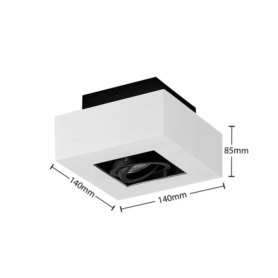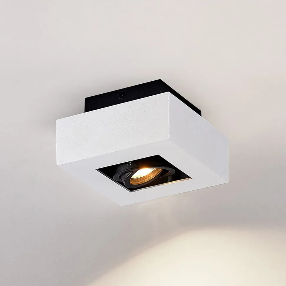 Firkantet Vince loftlampe med vippeindsats Den praktiske Vince loftlampe er et minimalistisk og moderigtigt tilbehør til hjemmet. Der er valgt en enkel hvid farve til huset, mens lyskilden er omgivet af en sort ramme. Designet i et klassisk farveskema og en kubisk form kan denne downlight nemt integreres i en række forskellige indretningsstile. Fordelen ved dette armatur er, at du kan styre lysets retning efter behov, da spotlightet kan drejes fleksibelt. En energibesparende LED-pære kan sættes i GU10-fatningen, som fås separat som tilbehør. Loftlampen har en skrueløs tilslutningsklemme til hurtig, bekvem og værktøjsfri tilslutning af ledningerne.
