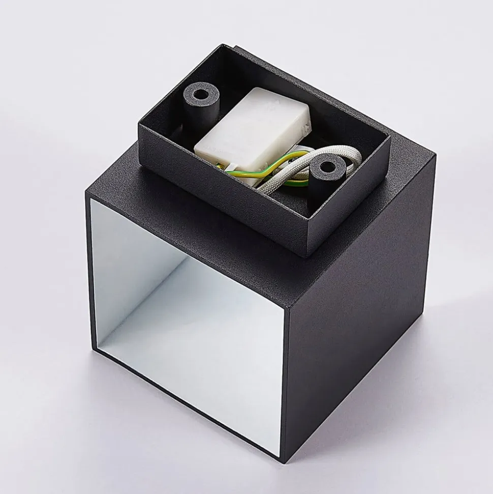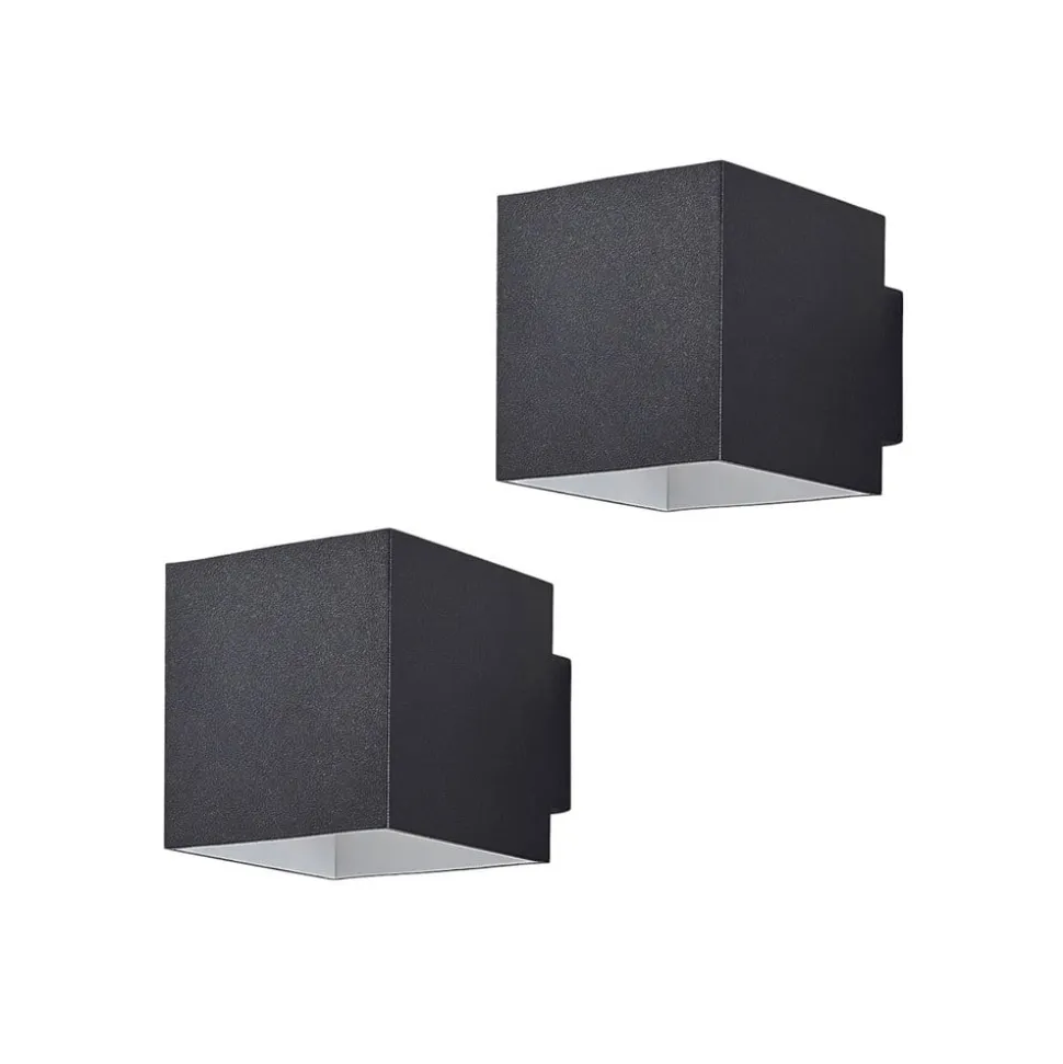 Sort Zuzana væglampe med effektivt lysudslip opad og nedad i et sæt med 2 Zuzana har en kompakt terningeform og er en lyskilde af aluminium med en sort finish. Indersiden af lampen er udstyret med en G9-pære, hvis lys kan slippe ud opad og nedad og skaber en effektiv glød på væggen. Designet har et moderne, men tidløst udtryk og kan nemt integreres i mange miljøer, hvor lyset giver et hyggeligt skær – væglampen leveres i et praktisk sæt med 2 stk