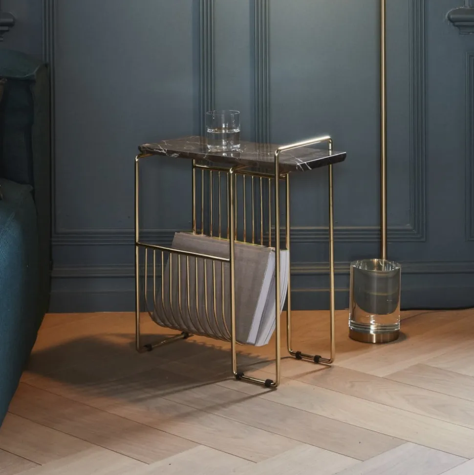 Sino magasinholder i marmor og stål Med Sino magasinholder får du også et lille, stilfuldt sidebord, som er perfekt til at stå ved siden af sofaen med en kop kaffe eller andet godt og tage en kort pause. Den integrerede magasinholder betyder, at du altid har dine yndlingsbøger og -magasiner lige ved hånden, mens stålrammen afrundes af en bordplade i marmor. Resultatet er den elegante allrounder Sino. produktinformation: Fremstillet af 100 % marmor og stål med gummifødder. Maksimal belastningskapacitet 5 kg. plejeinstruktioner: For at fjerne snavs og støv skal du tørre emnet af med en fugtig klud. Marmor tåler ikke syrer eller sure rengøringsmidler som f.eks. eddike. Sørg for at tørre sure og normale væsker, der spildes på overfladen, af med det samme for at undgå pletter.
