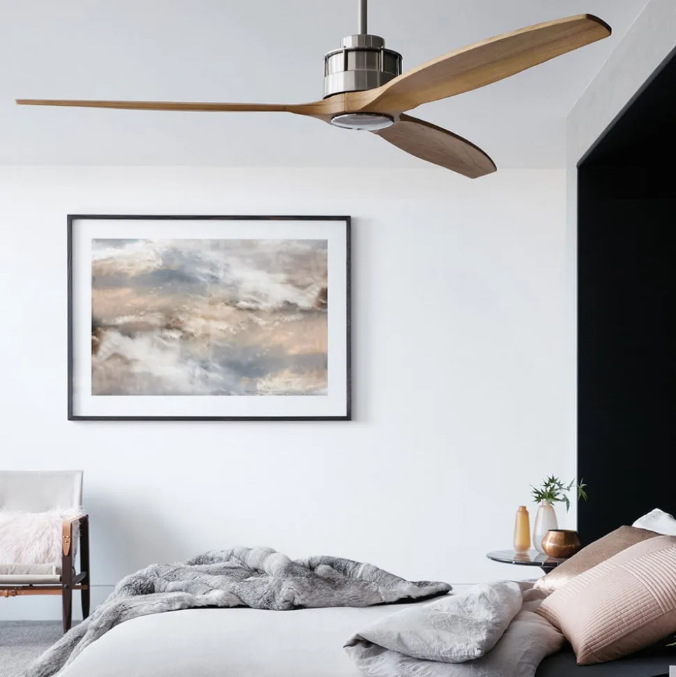 Den absolutte blikfang er loftventilatoren Airfusion Akmani med massive trævinger i teak-look, som desuden udmærker sig ved den særlige støjsvage drift af den energibesparende DC-motor, der også gør den velegnet til brug i soveværelser og hvilerum.