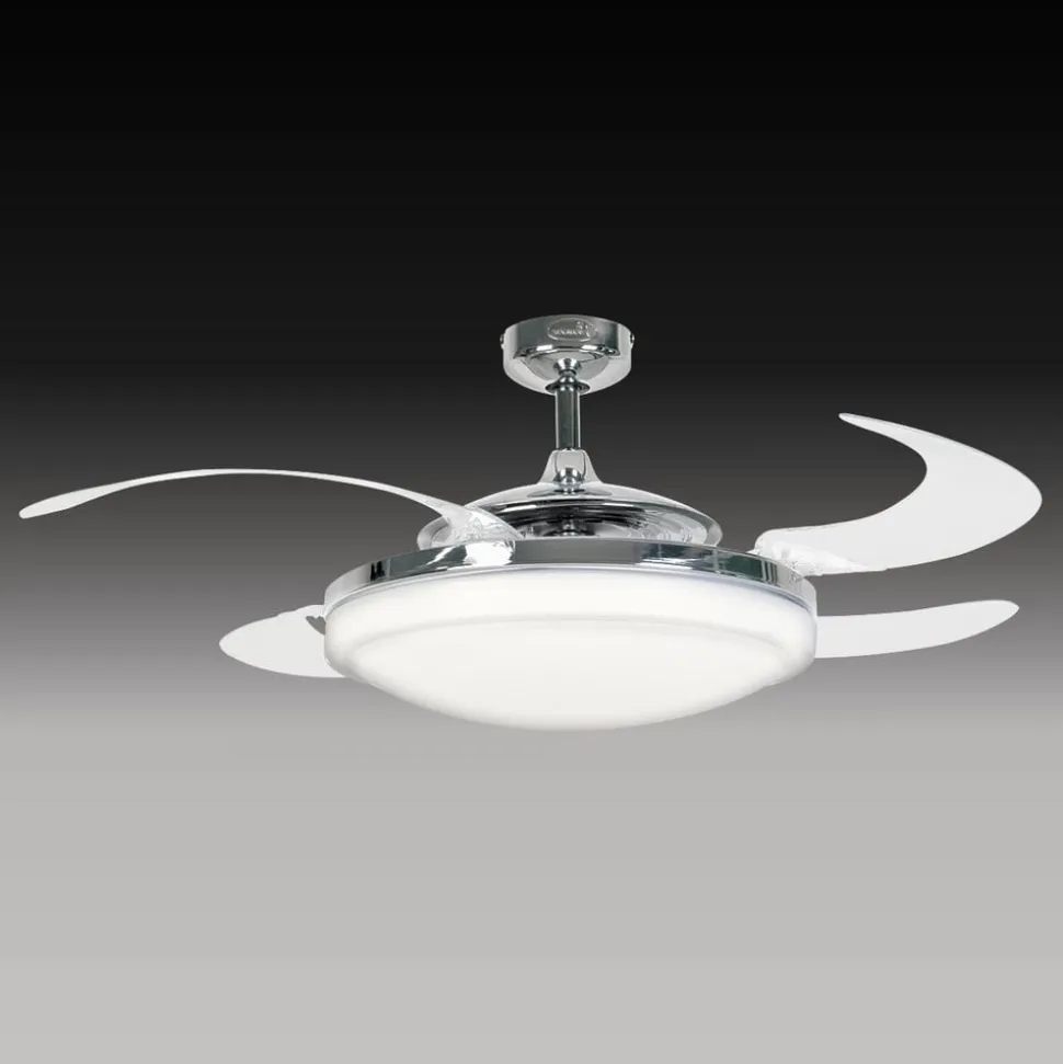 Fanaway Evo 2 optrækkelig loftventilator med belysning Rammen på Fanaway Evo 2 loftventilatoren er lavet af metal. De gennemsigtige rotorblade kan foldes væk, når de ikke er i brug. Når vingerne er foldet ind, reduceres diameteren til 47,2 cm. Ventilatoren er udstyret med et stort lys i frostet glas og giver også generel belysning i rummet. Med en diameter på 122 cm er den velegnet til mellemstore rum på op til 20 m². Fanaway Evo 2 giver ikke kun en kølig brise om sommeren, den kan også køre i omvendt tilstand om vinteren og fordele den varme luft fra loftet jævnt i hele rummet. Fjernbetjening: tænd/sluk og 3 justerbare indstillinger. Hukommelsesfunktion inkluderet. Lyset kan også styres via vægkontakten. Tekniske data – Strømforbrug: 60 watt – Luftgennemstrømning 180 m³ Særlige egenskaber Fanaway Evo 2 kører meget stille (ingen hørbar motorstøj), ideel til at friske luften op i soveværelser.