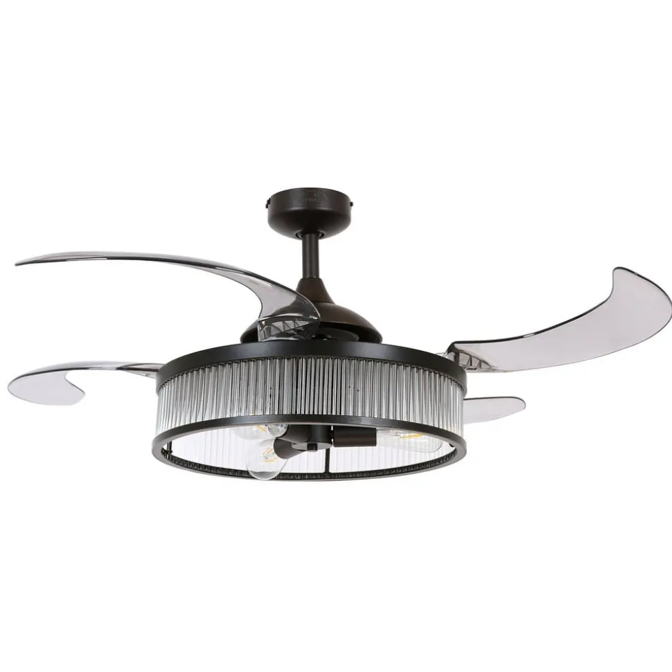 Fjernbetjent loftsventilator med fire vinger Fanaway Corbelle – kan også bruges som loftslampe Fanaway Corbelle kan bruges som mere end bare en ventilator; takket være en foldemekanisme på vingerne kan de trækkes ind. Hvis det er nødvendigt, efterlader det en ren loftslampe med tre attraktive ST64 rustikke lamper i glødetrådslook. Funktioner Hastigheden kan reguleres i tre trin afhængigt af den ønskede luftcirkulation. Mens Fanaway Corbelle giver en behagelig brise om sommeren, kan rotationsretningen også indstilles til vintertilstand. Den varme rumluft under loftet omfordeles således nedad, hvilket sparer varmeomkostninger. Fanaway Corbelle styres ved hjælp af fjernbetjeningen, der er inkluderet i leveringsomfanget. Tekniske data – Hastighed: 130/175/230 o/min – Ventilatoreffekt ved maksimal hastighed: 60 W – Luftcirkulation: maks. 180 m³/min – Velegnet til 3 x E27-pærer, maks. 25 W pr. stk